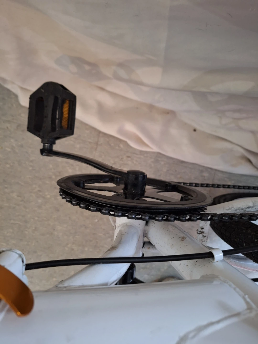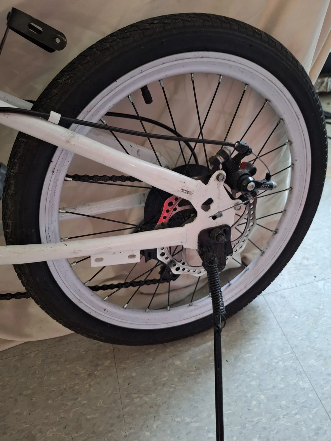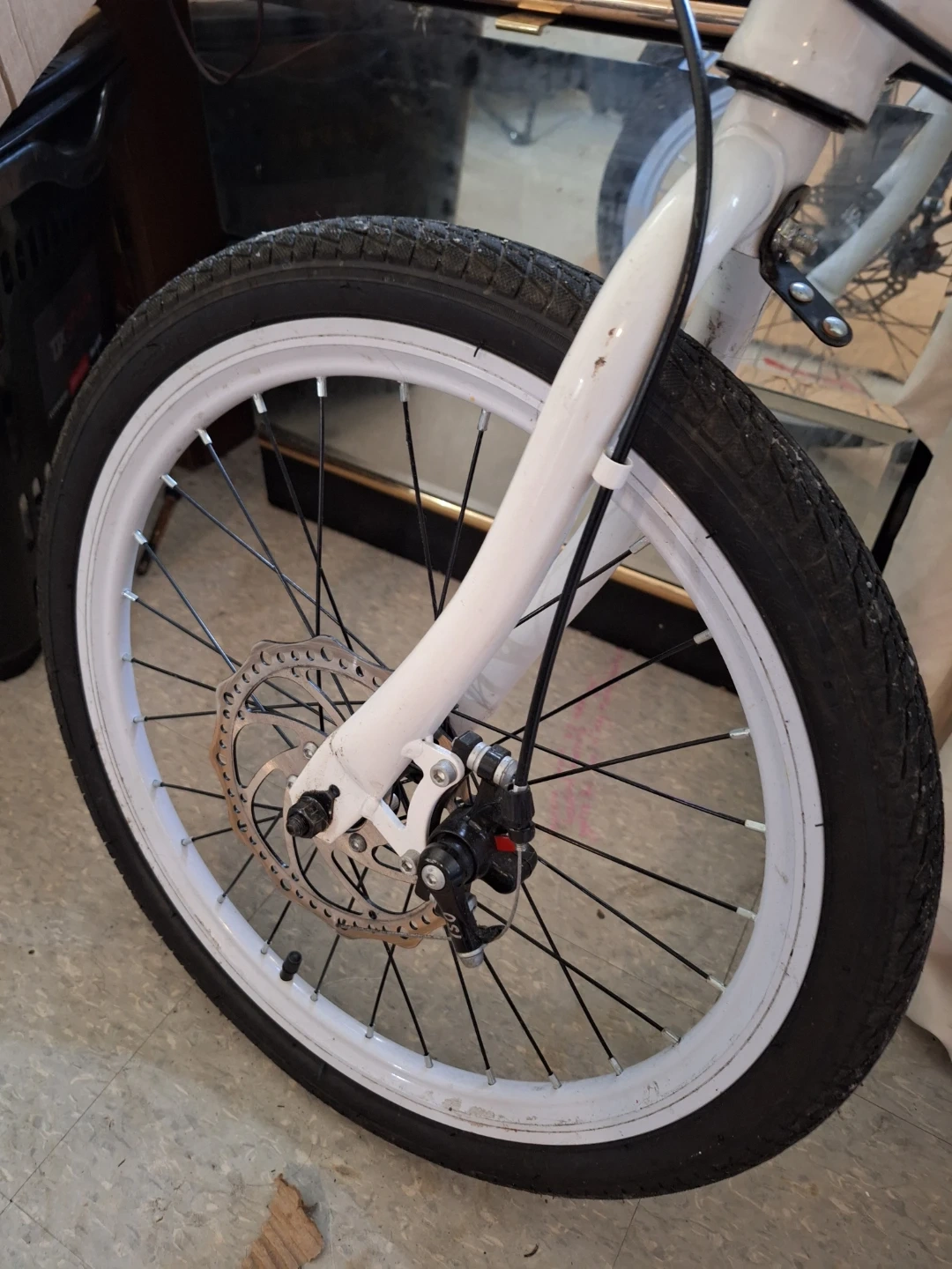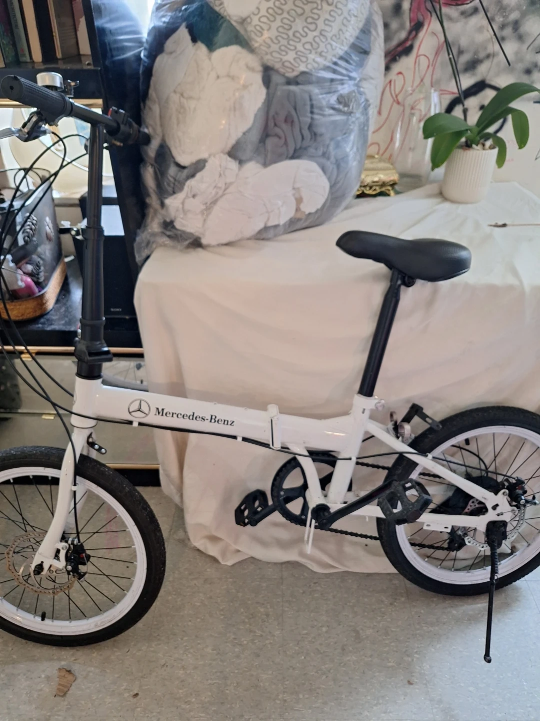 White Mercedes-Benz folding bike with 20-inch wheels. It features disc brakes for reliable stopping power. This bike is easy to fold for convenient storage and transport.