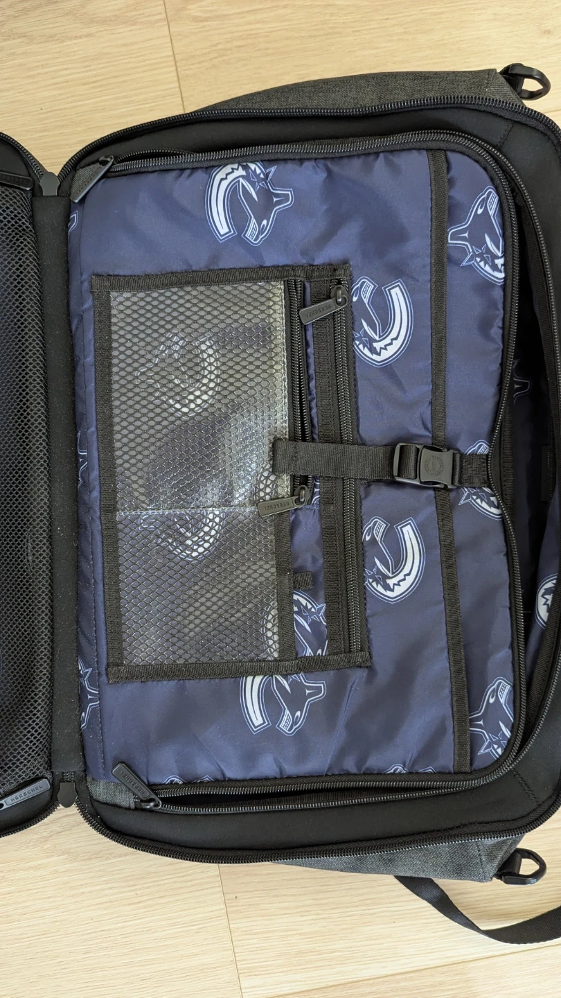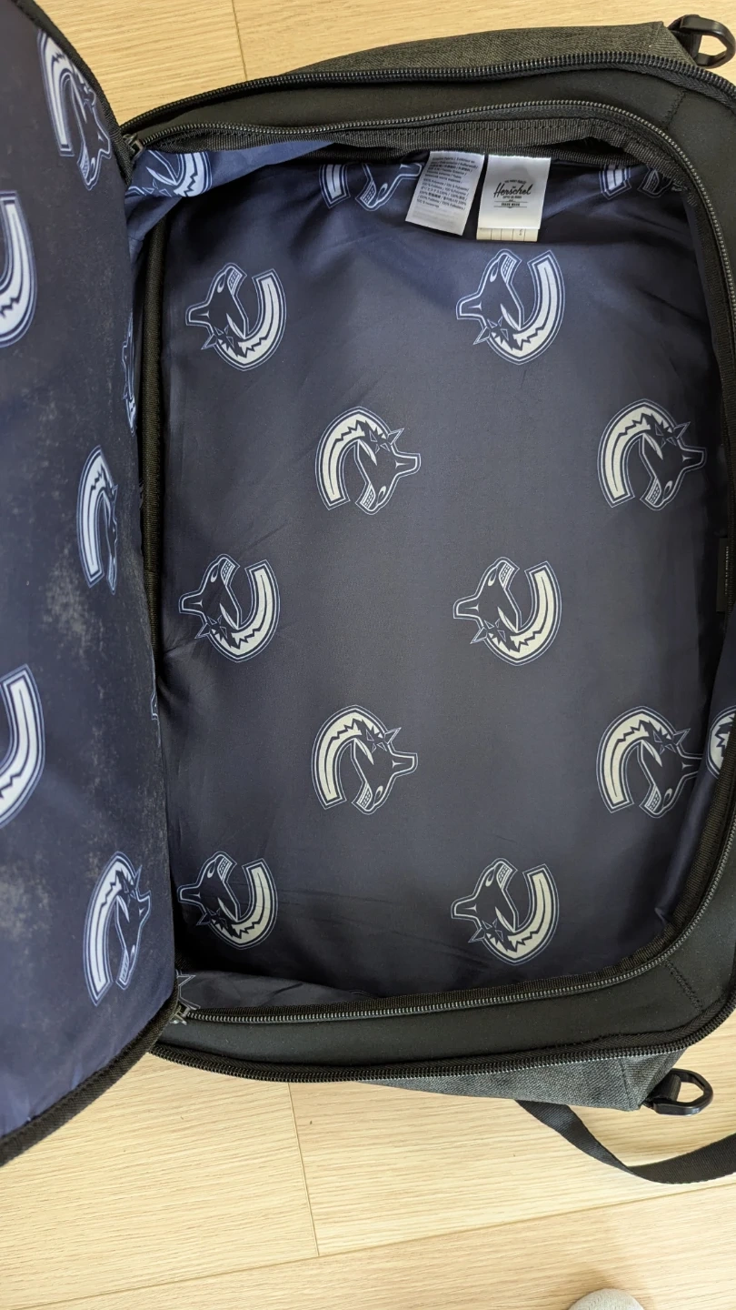 This Herschel duffle backpack features a cool Vancouver Canucks team logo lining. It's a versatile bag for travel or everyday use. It has multiple compartments for organization.