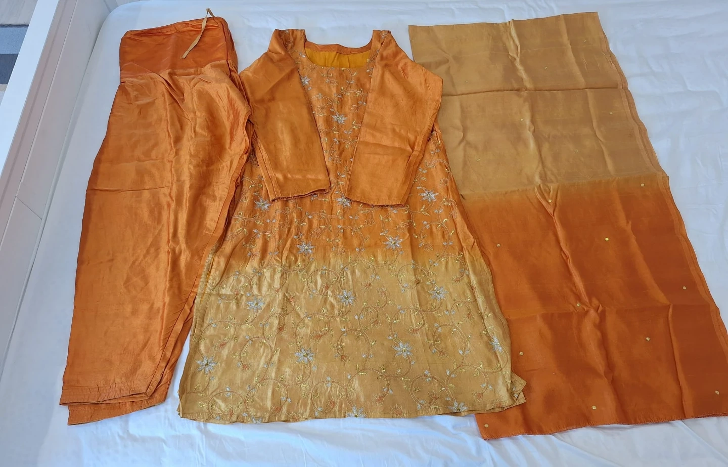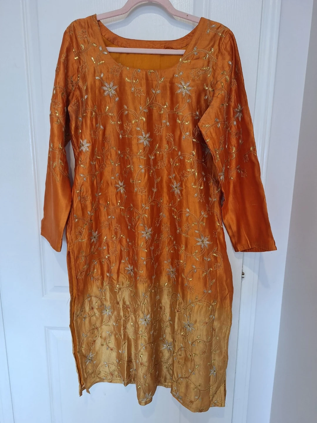 Beautiful, silk tailored salwar with full lining on kurta and salwar and lovely dupatta. Stitched a few years ago from India, worn just 2-3 times. Drycleaned and ready to use!