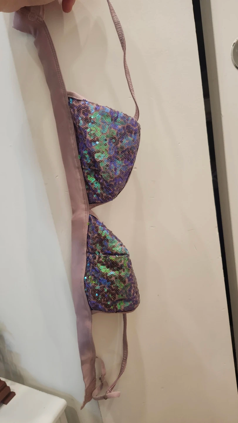 Sparkly sequined bikini top in a soft lavender shade. It features adjustable straps and a clasp closure for a custom fit. Perfect for adding some shimmer to your beachwear or festival outfit!