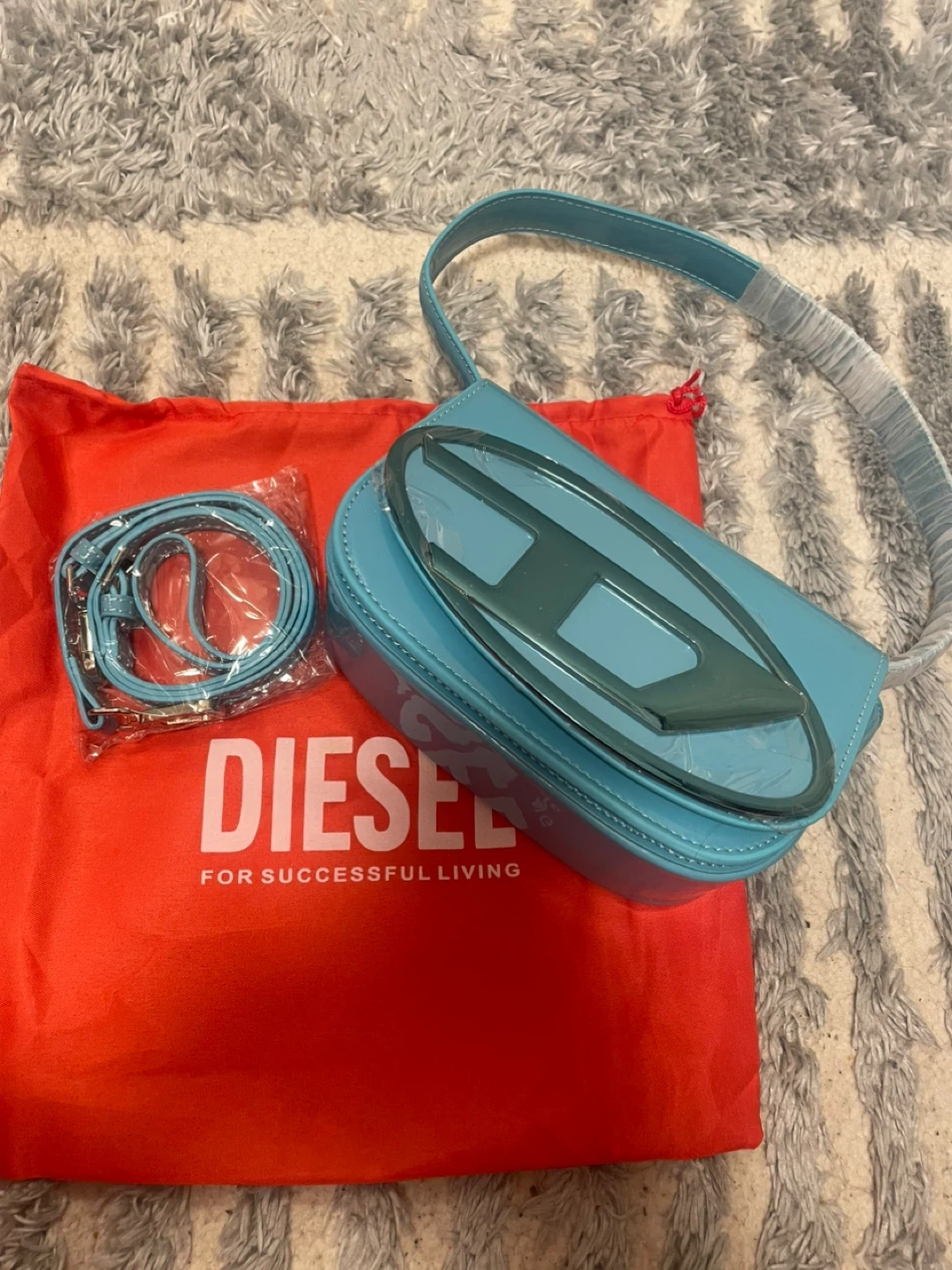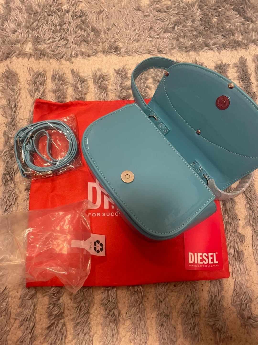 This is a bright blue patent leather shoulder bag by Diesel. It comes with a matching dust bag for storage. The bag features the signature Diesel 'D' logo on the front.