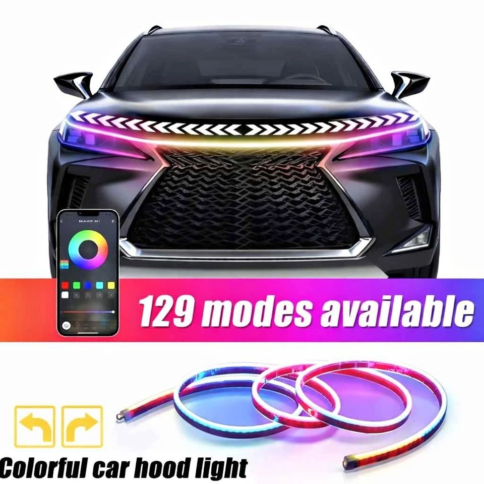 Brand New. Upgrade your vehicle’s front styling with this 12V RGB LED Car Hood Light Strip, designed with an ultra-thin profile for a clean daytime running light appearance. Featuring dynamic scanning and streamer effects, this light adds a modern and aggressive look while maintaining smooth and uniform illumination. Built with a silicone hose and high-brightness LEDs, the strip is flexible, durable, and rated IP66 waterproof, making it suitable for all weather conditions. Using the mobile app, you can adjust colors, flow modes, and lighting behavior to match your driving status. The intelligent turn signal function automatically synchronizes with your vehicle’s steering signals, creating a flowing streamer effect when turning left or right. Features: Start scanning mode and illusion streamer mode, Streamer turn signal with automatic steering detection, Adjustable color and flow modes via mobile app, Ultra-thin design for clean hood and DRL installation, Bright and uniform lighting output, Weather-resistant construction for daily driving. Specifications: Voltage: 11–15V, Power: 10W per meter, Size: 2.4m, Waterproof Grade: IP66, Material: Silicone hose with high-brightness LED light, App Control Distance: 10–15 meters. Wiring Instructions: Red wire: ACC power supply, Black wire: Ground or negative, Yellow wire: Left turn signal positive, Blue wire: Right turn signal positive. Power Connection Guide: For start-up lighting: Connect the red wire to the ACC fuse inside the fuse box. ACC supplies power when the vehicle is started and turns off when the vehicle is shut down. For night lighting connection: Connect the red wire to the positive wire of the headlight assembly harness. Pickup In Hamilton, ON.
