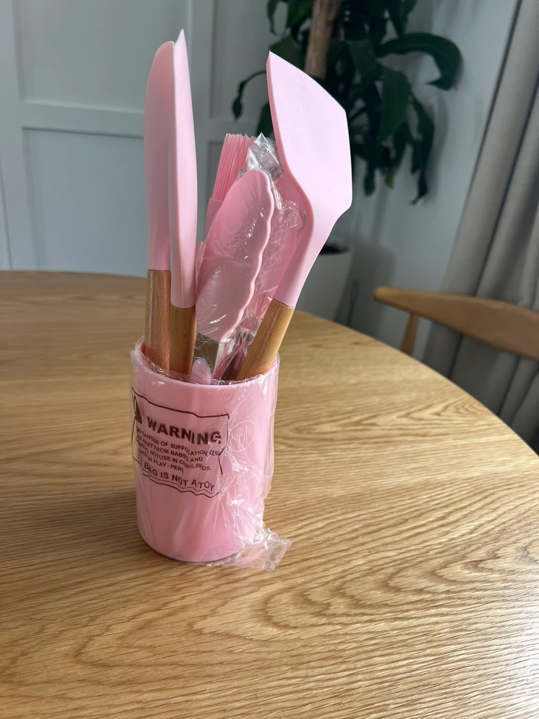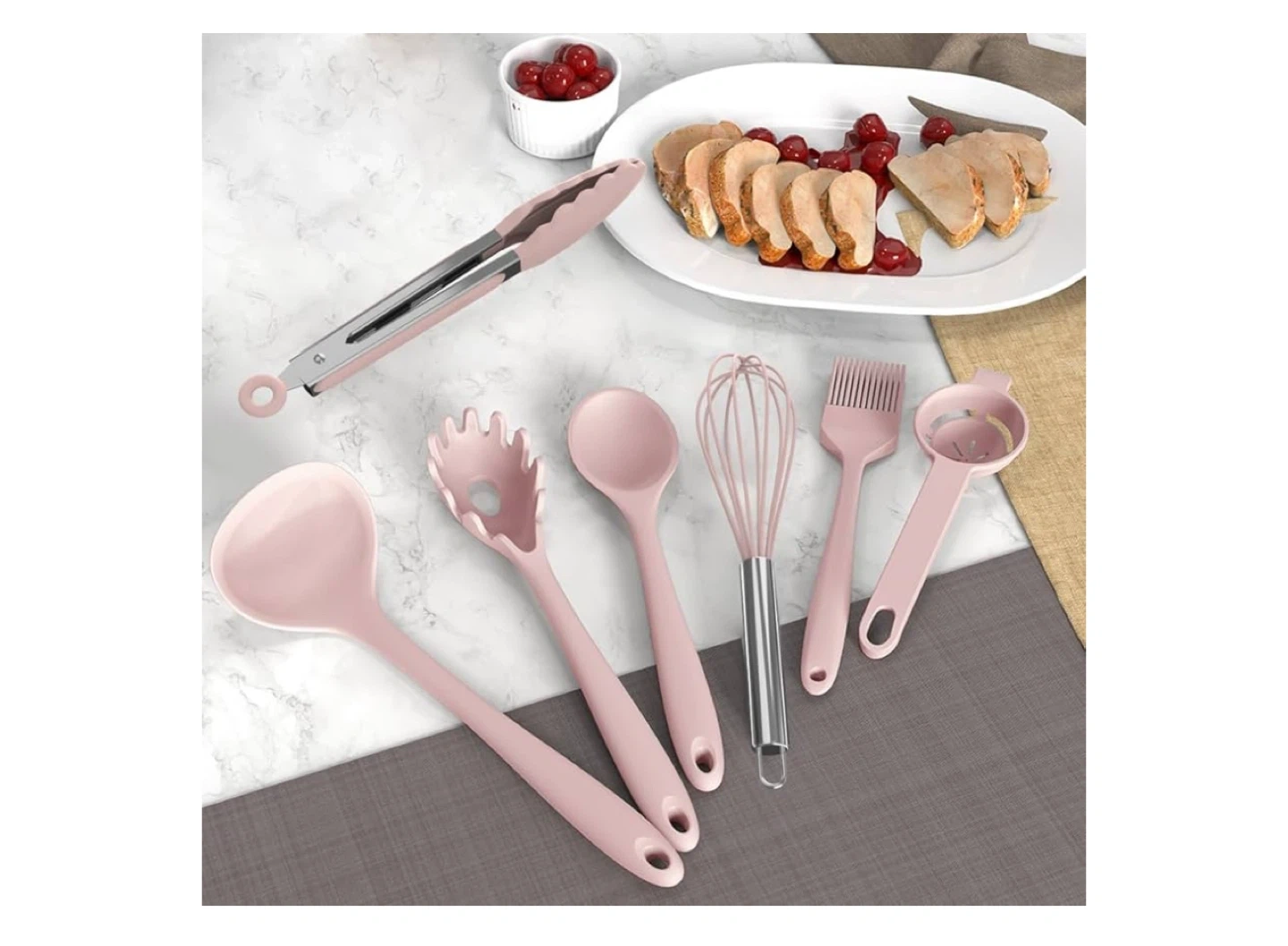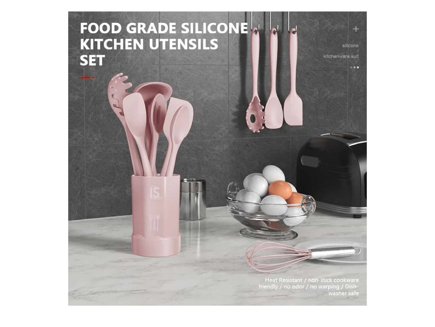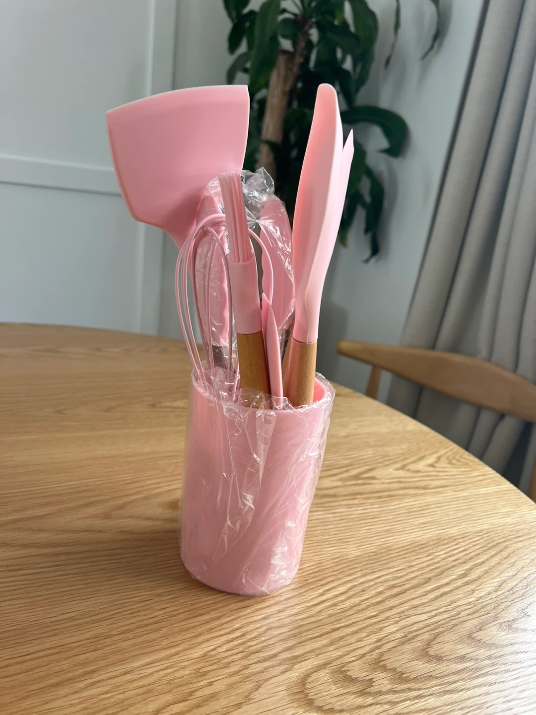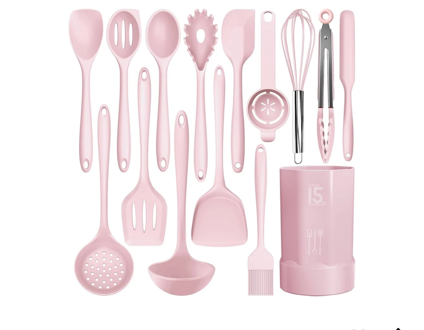 This 15-piece kitchen utensil set comes in a lovely pink colour. It's made from food-grade silicone and is heat resistant, non-stick, and dishwasher safe. This set includes a variety of tools for all your cooking needs!