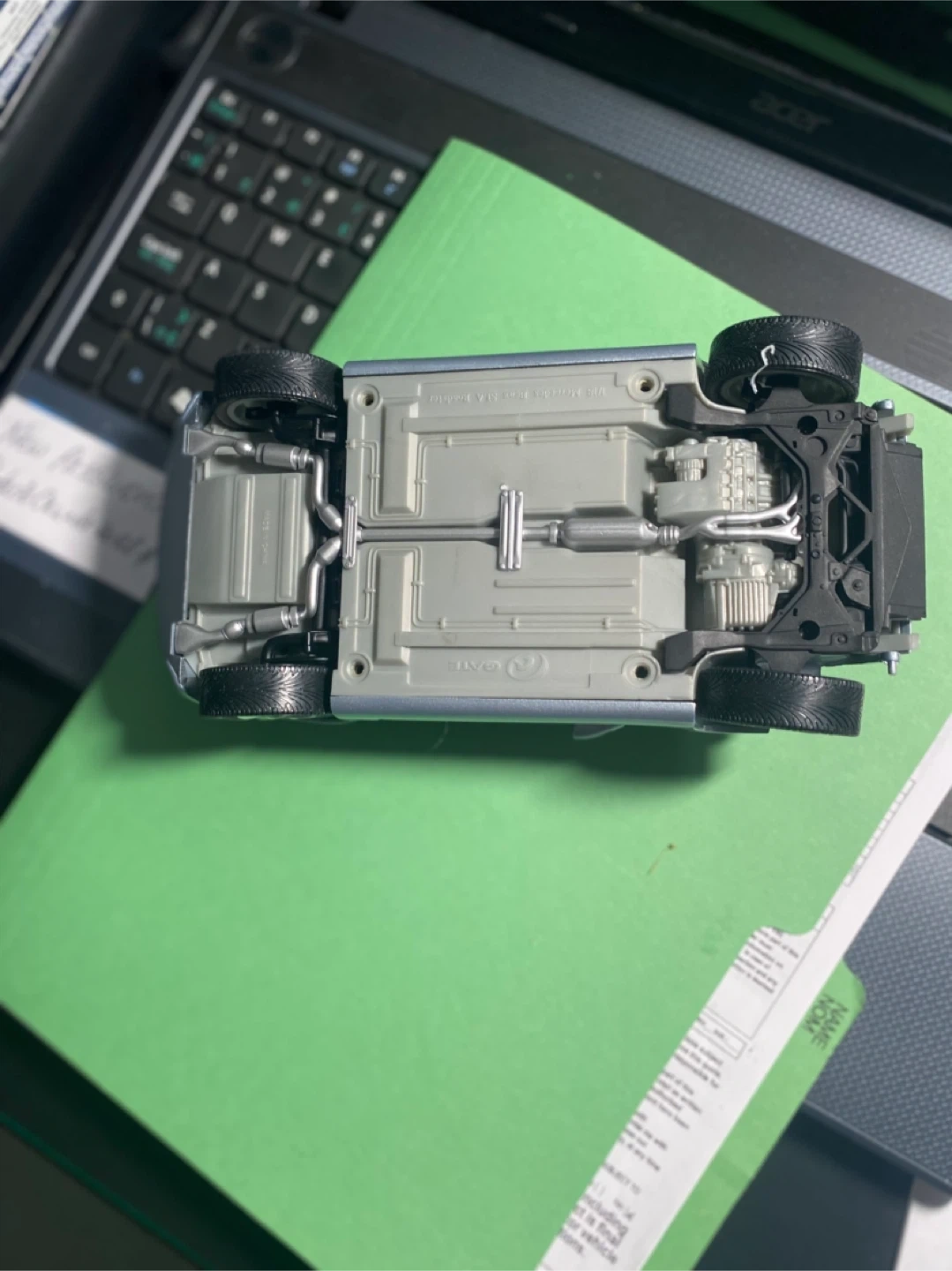 A silver Mercedes-Benz convertible car. It's a detailed model with realistic interior and undercarriage components. This is great for collectors or kids who love cars!