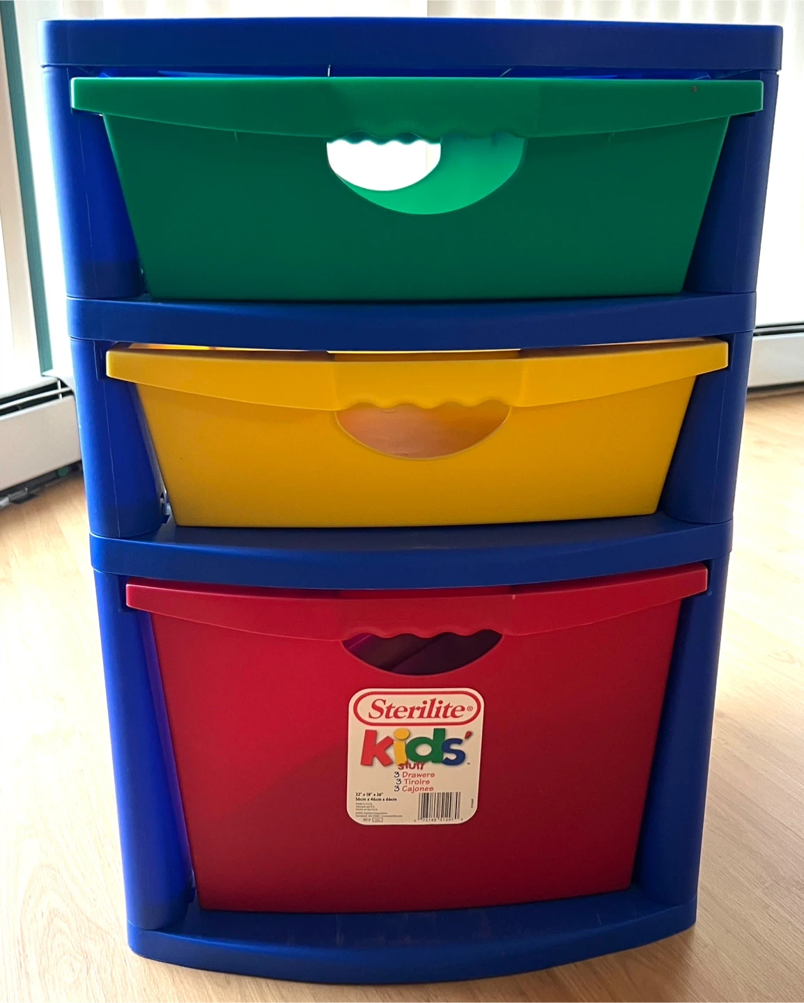This Sterilite storage unit comes with three colourful drawers for organizing.