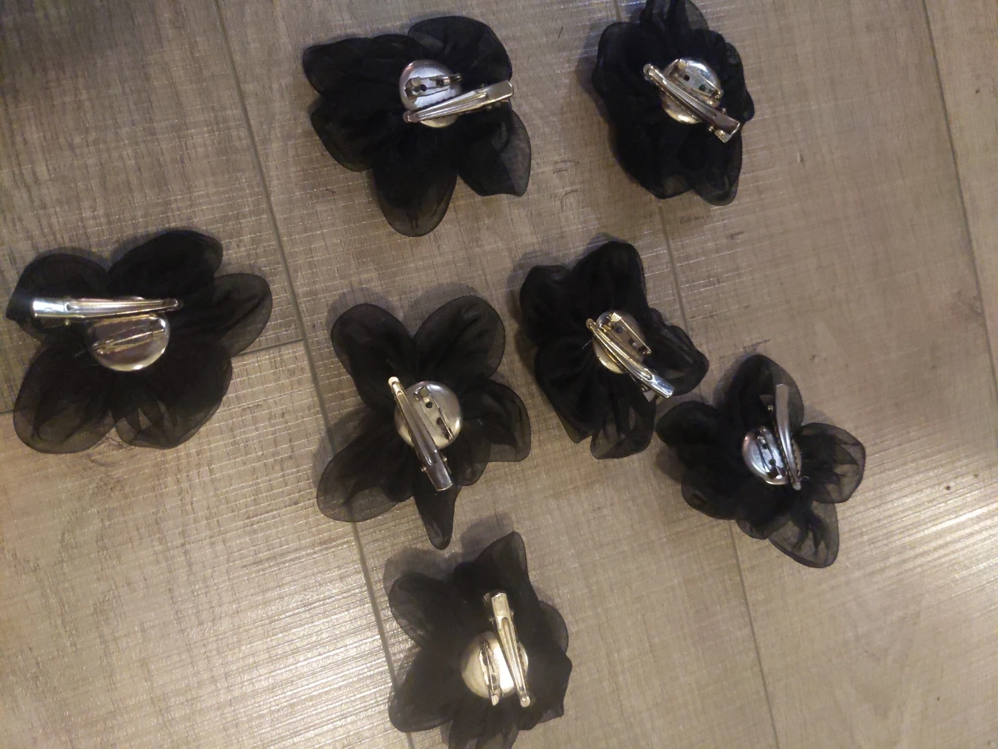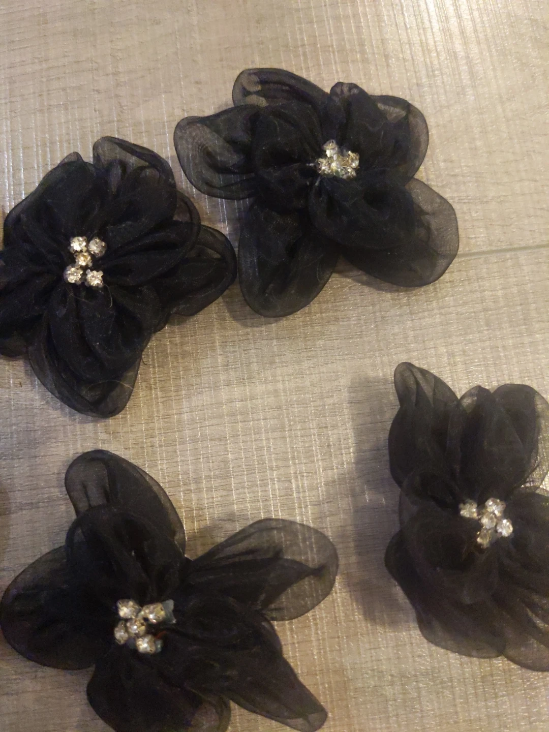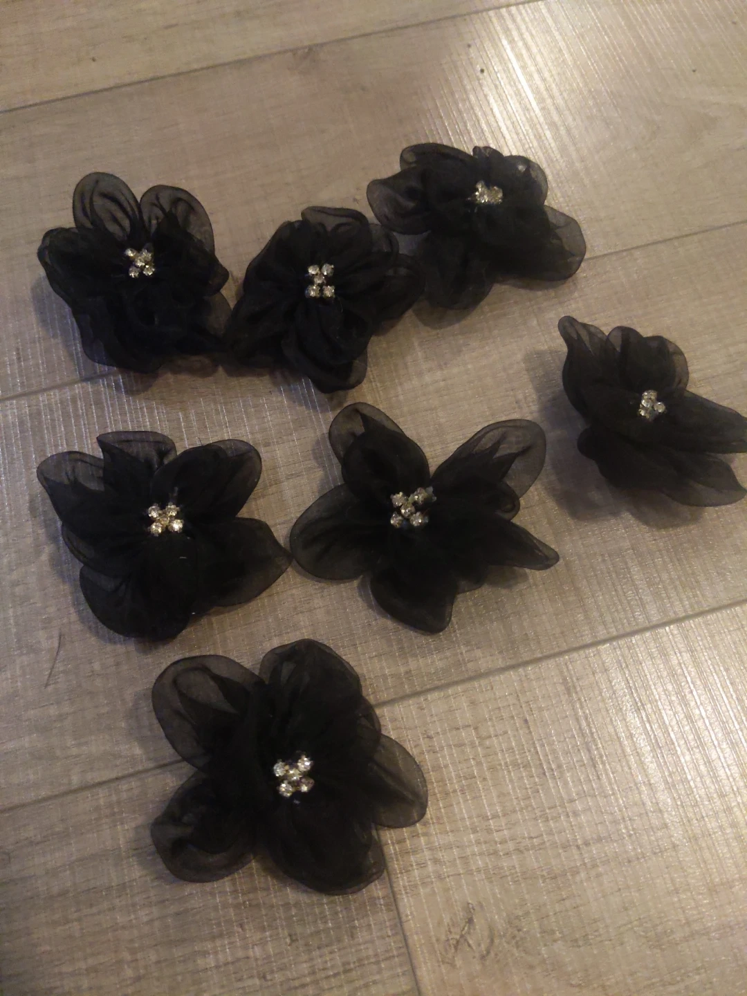 This is a set of seven black organza flower appliques, each with a sparkling rhinestone centre. They're about 2-3 inches in diameter. Great for crafts, sewing, or decorating accessories!