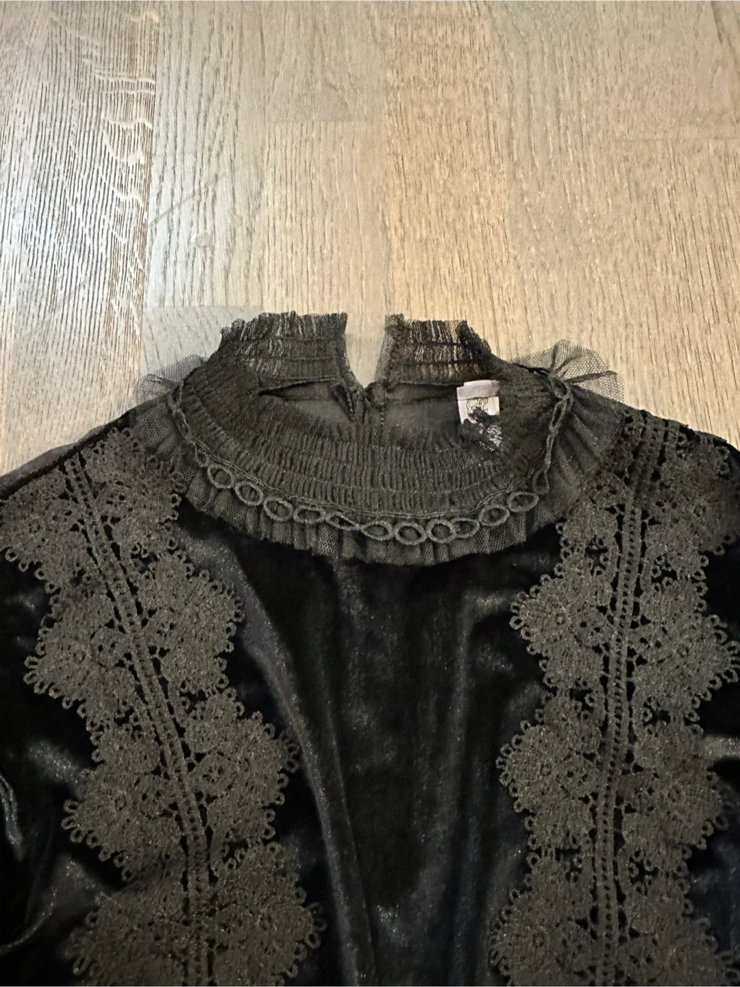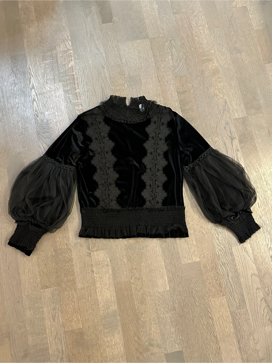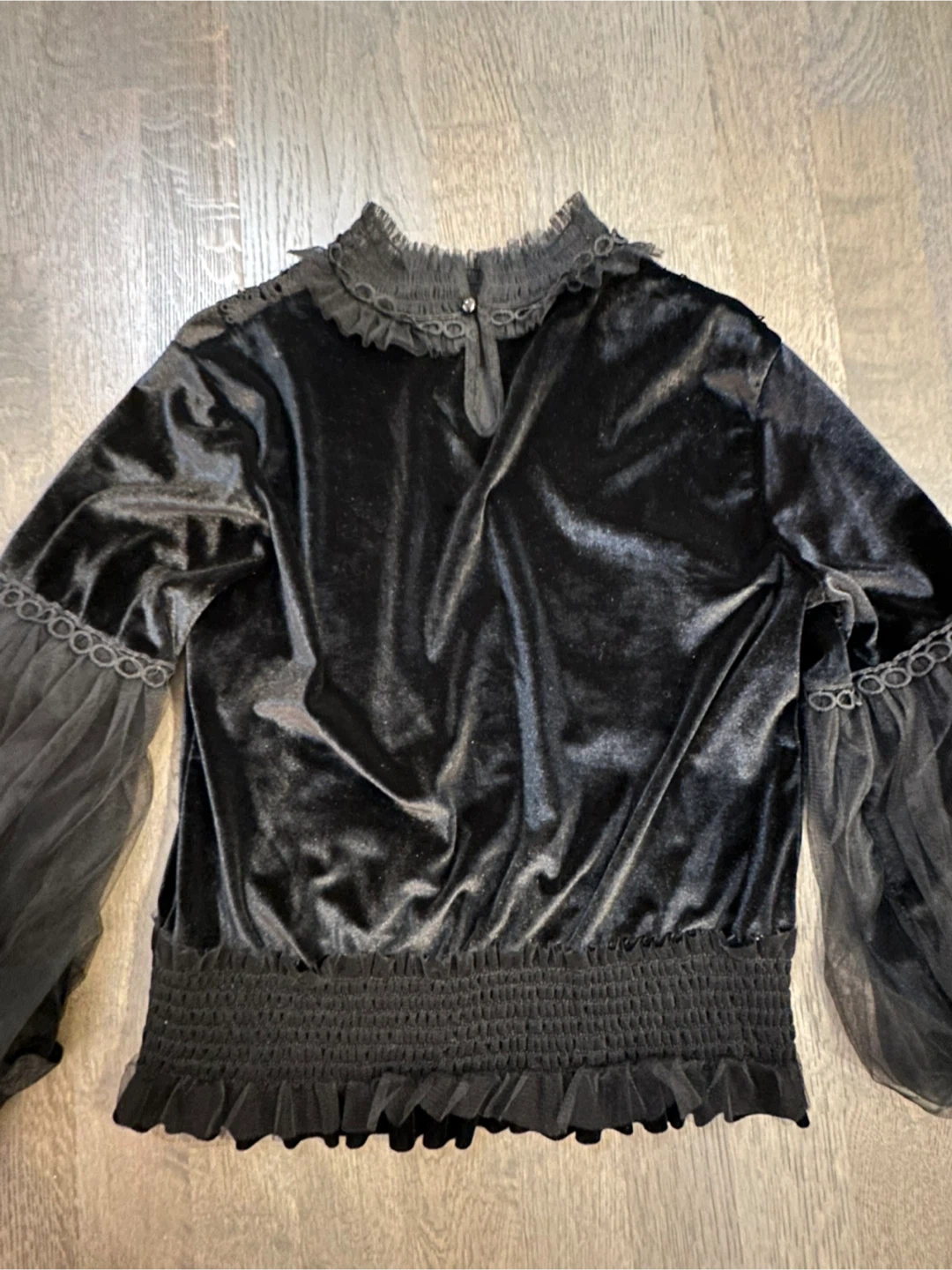 Black velvet top with lace trim and sheer puff sleeves. It features a ruffled high neckline and smocked waistband. This top adds a touch of gothic elegance to any outfit!