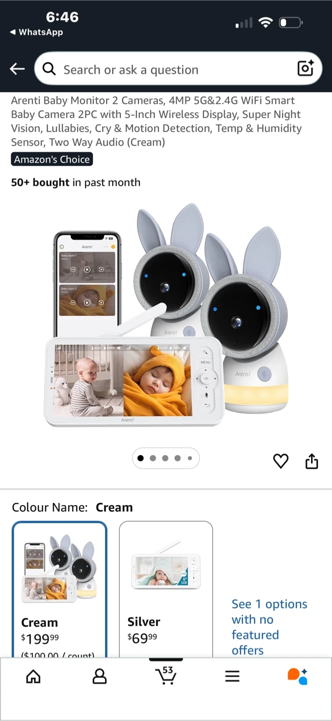 This is the Arenti baby monitor system with two cameras and a 5-inch wireless display. It's equipped with 5G&2.4G WiFi, super night vision, lullabies, and cry & motion detection. It also includes a temperature & humidity sensor and two-way audio. The colour is cream.
