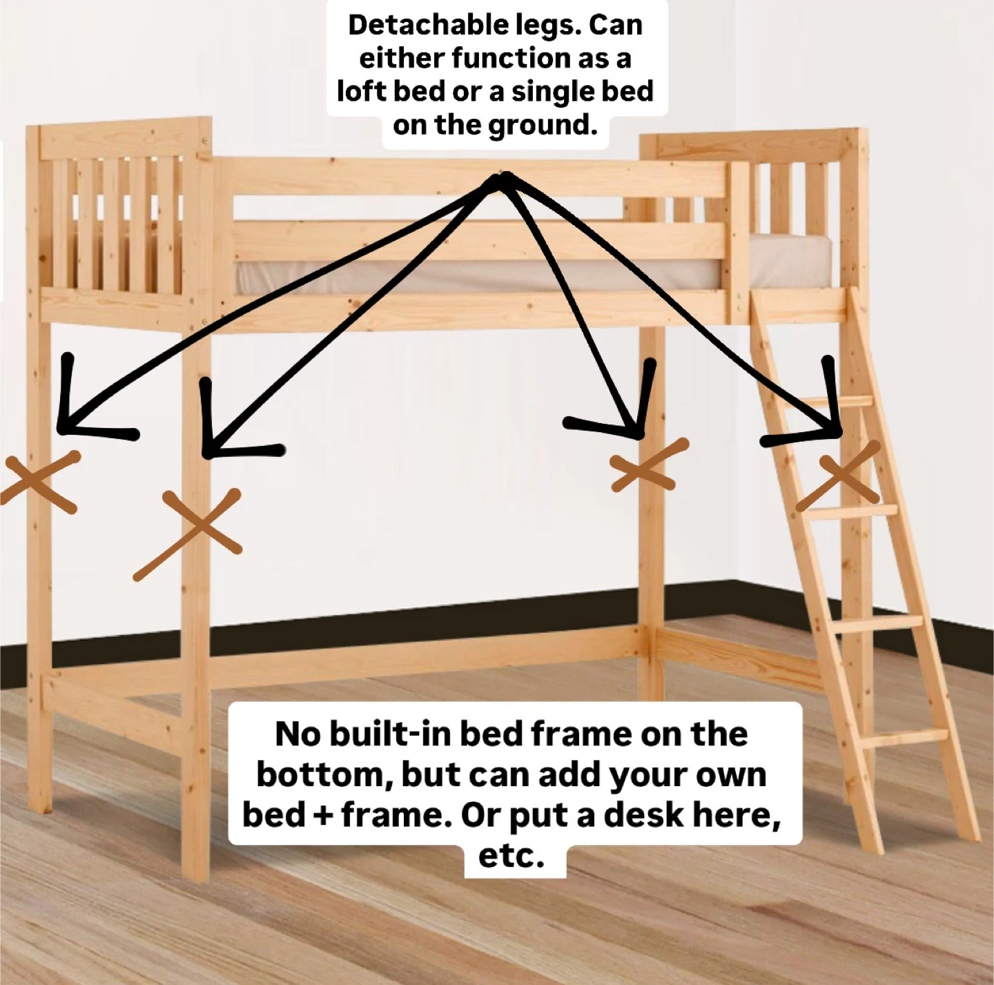• Has modular (detachable) legs. When the lower sections of the legs are installed, the bed functions as a raised loft bed (with space underneath). When they are removed, the upper portion can be used independently as a single bed placed directly on the floor.