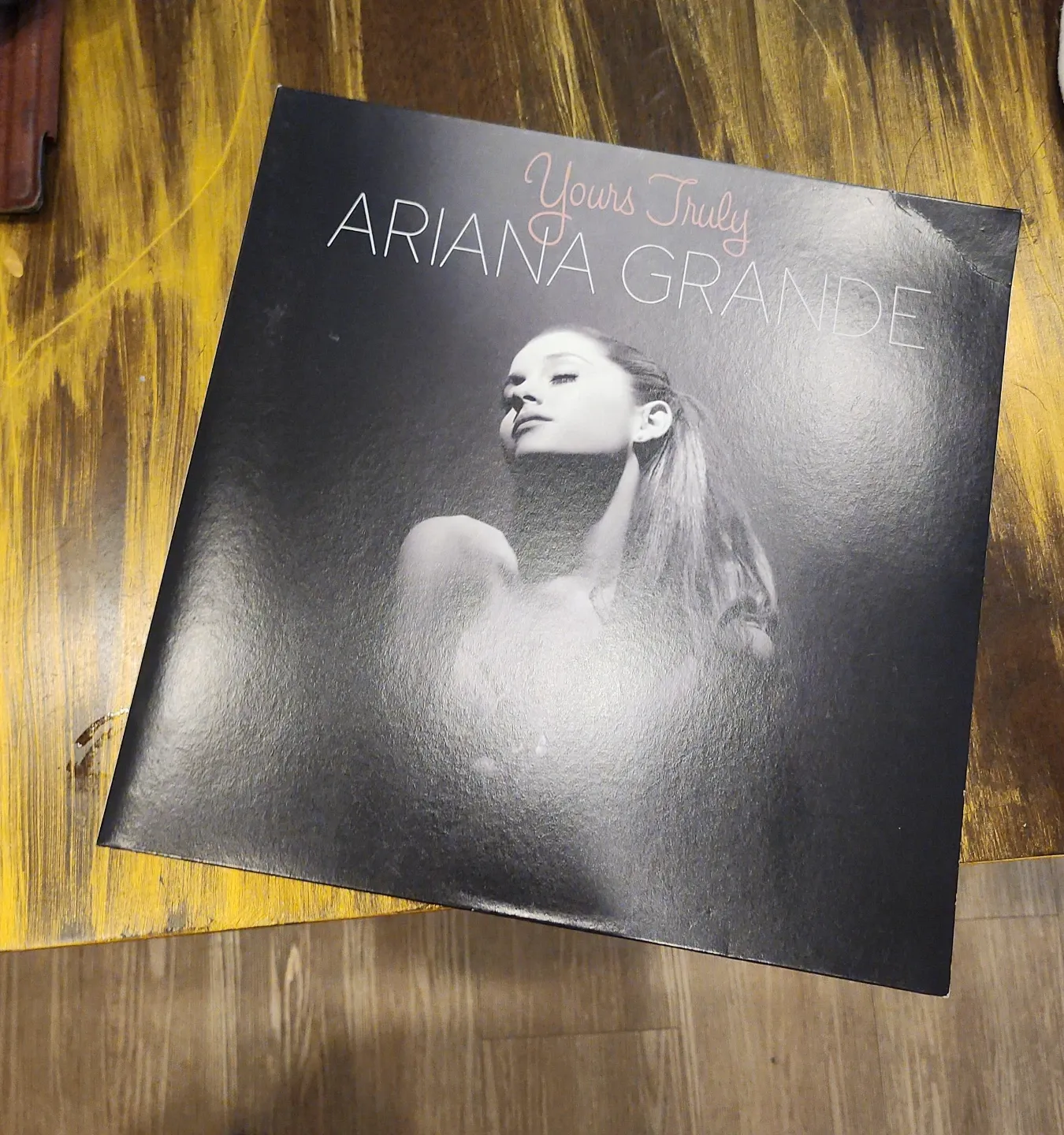 Ariana Grande's debut studio album, 'Yours Truly', on vinyl record. Features tracks like 'The Way' and 'Baby I'. Includes original sleeve.