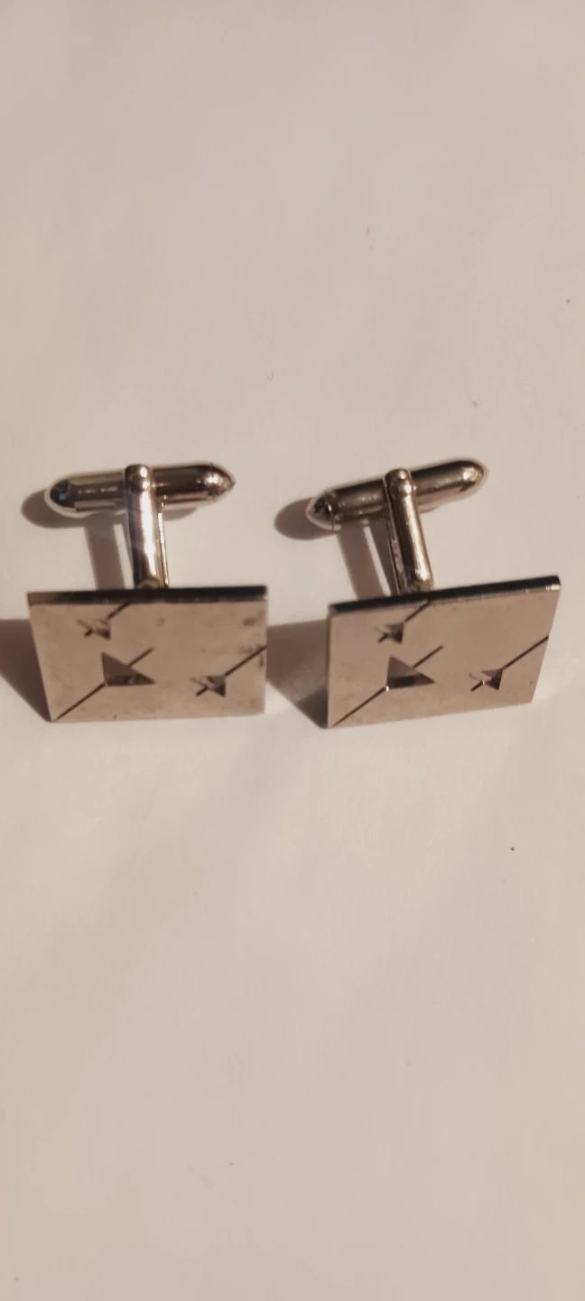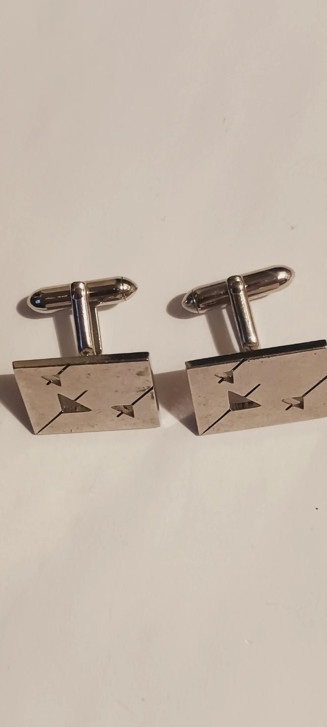 A pair of Mid Century silver-tone cufflinks featuring a subtle arrow design. They're made of metal with a swivel backing. These cufflinks add a stylish touch to any dress shirt! 1"×1". Excellent condition..ALL MY PRICES ARE NEGOTIABLE !!