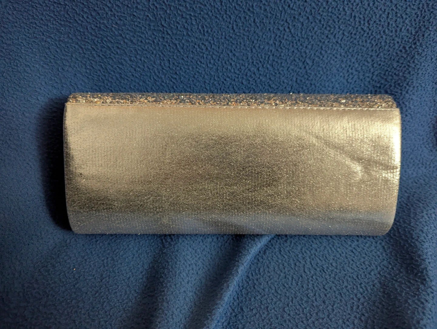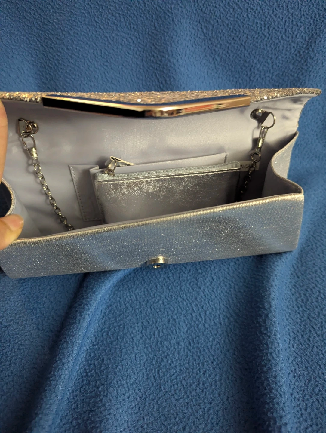 Sparkly silver clutch purse. It's an envelope style with a glitter flap and a metallic trim. Includes a small matching coin purse inside. Comes with a detachable silver chain strap. Completely new, never used!