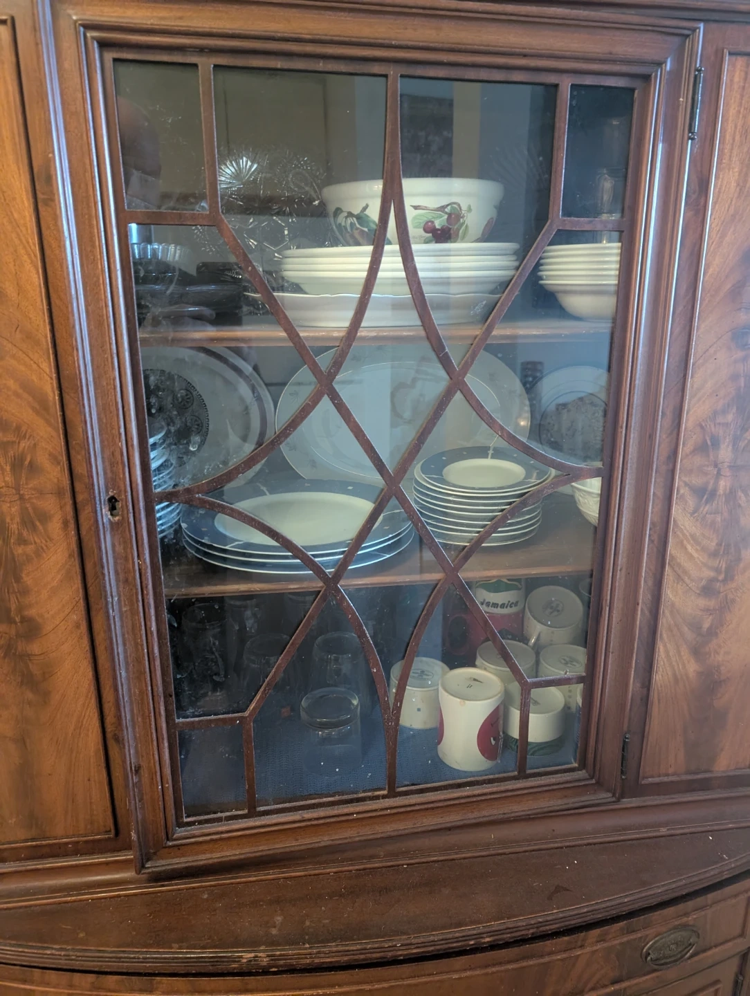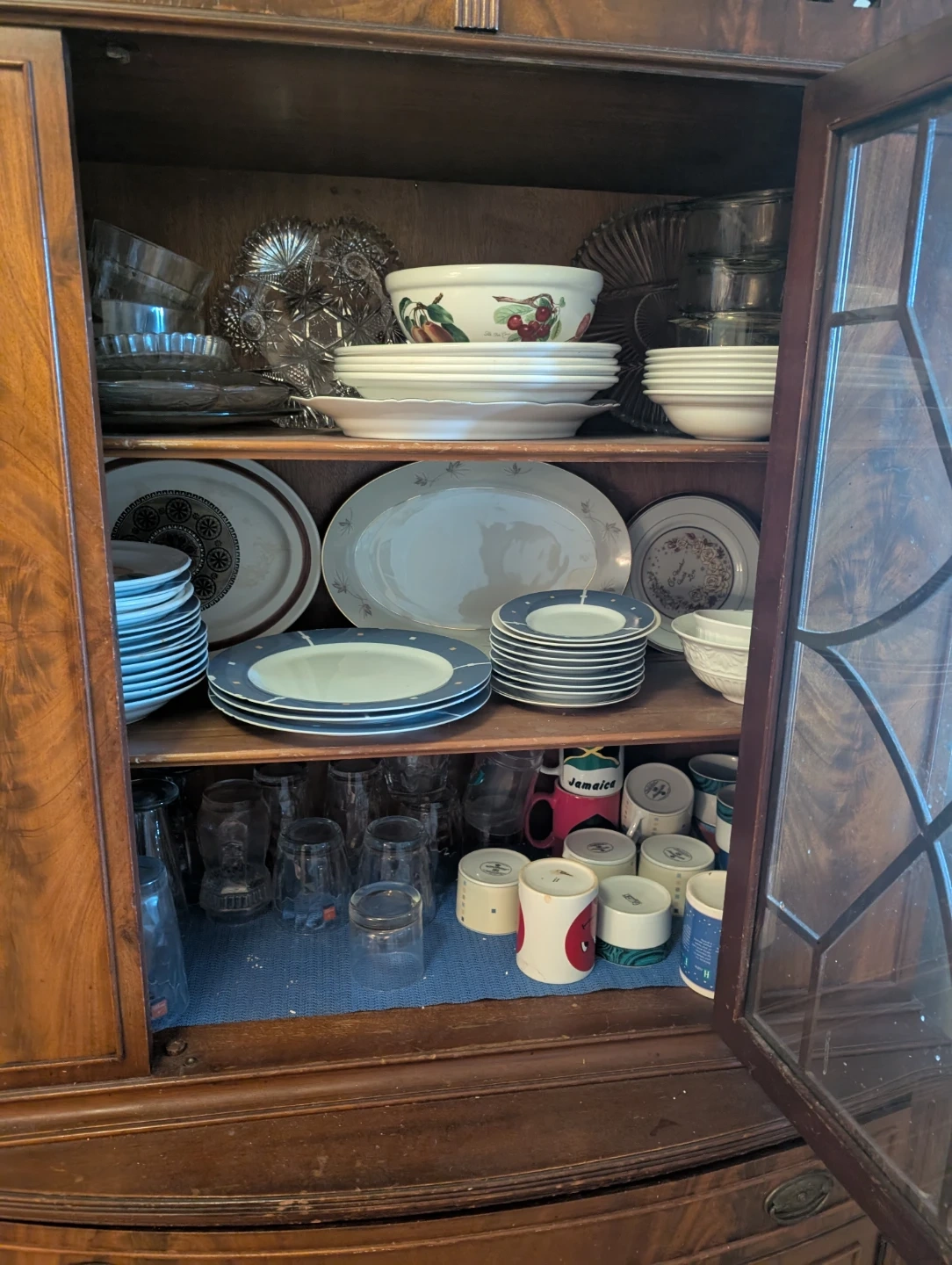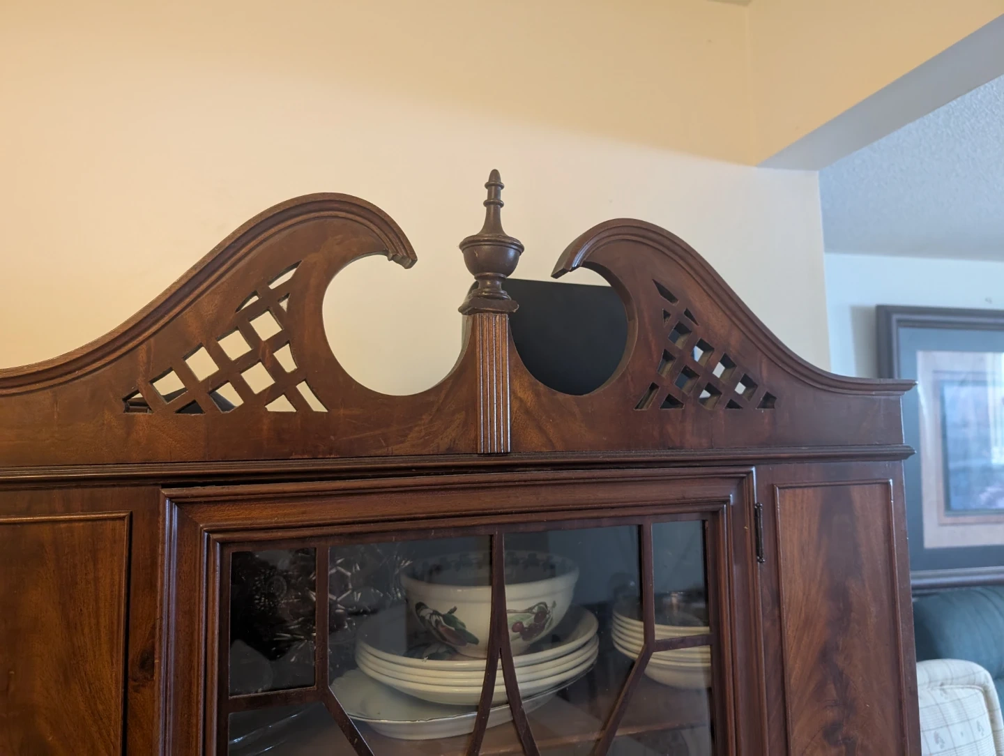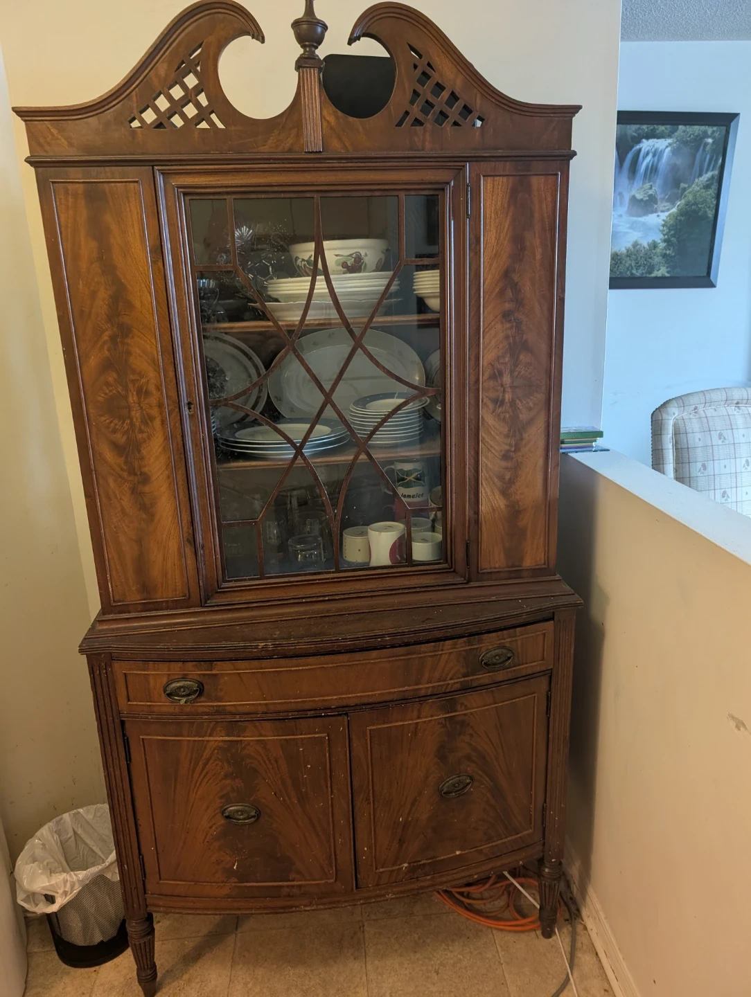 This antique china cabinet features intricate detailing and glass doors, perfect for displaying your dinnerware. It includes multiple shelves for ample storage. The cabinet has a warm wood finish.