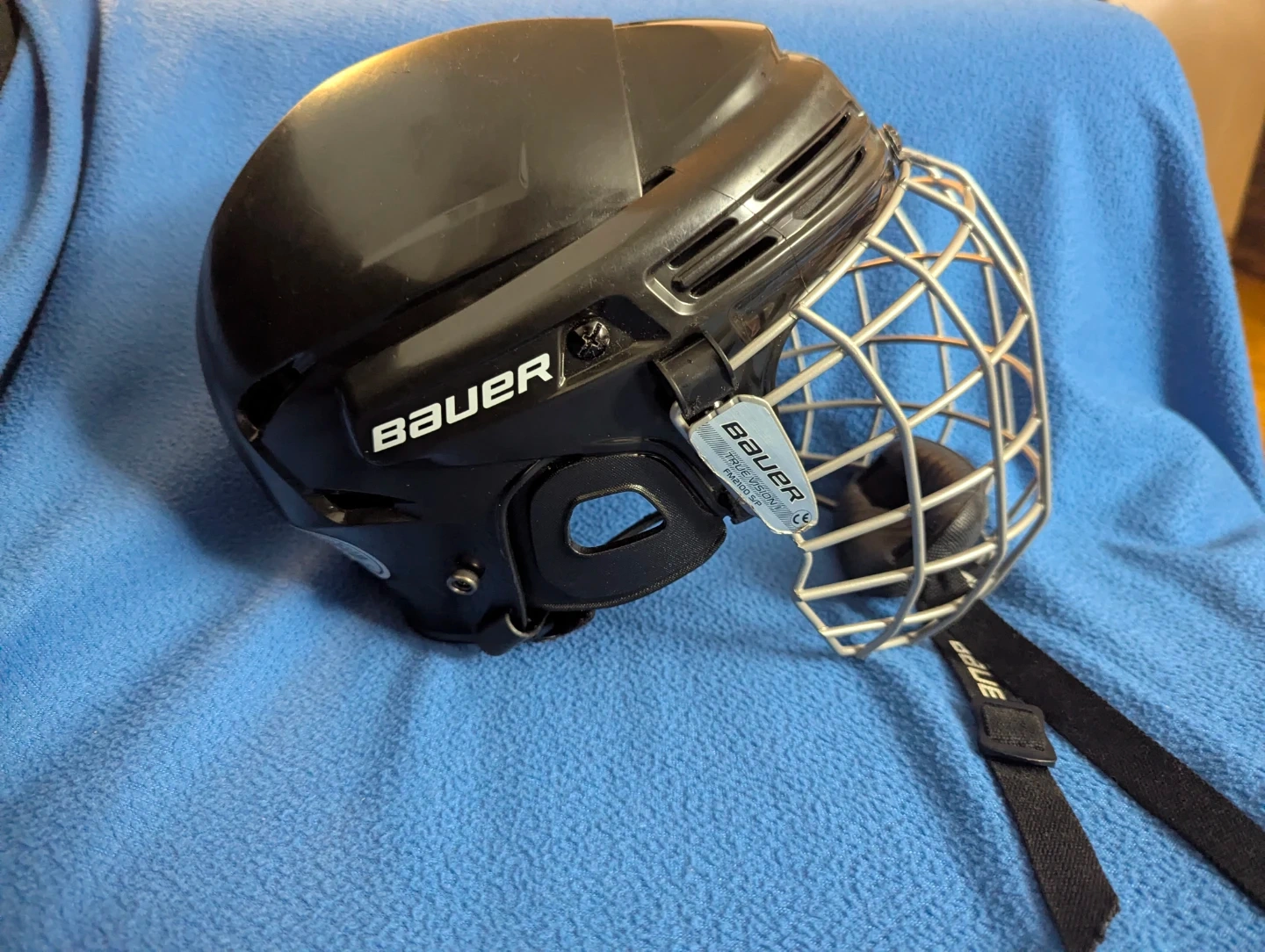 This is a black Bauer hockey helmet with a silver cage. It's a certified hockey helmet. It comes with adjustable straps for a secure fit. Safety first! Great for children who are learning to skate. The size is small (52-57cm)