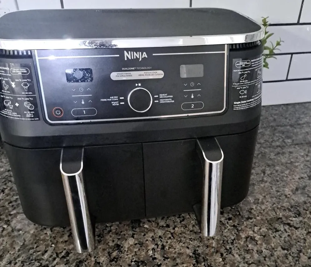 This Ninja DualZone air fryer features Smart Finish and Match Cook technology. It offers multiple cooking functions including Air Fry, Roast, Reheat, Dehydrate, and Bake. It's great for cooking two different foods at once!