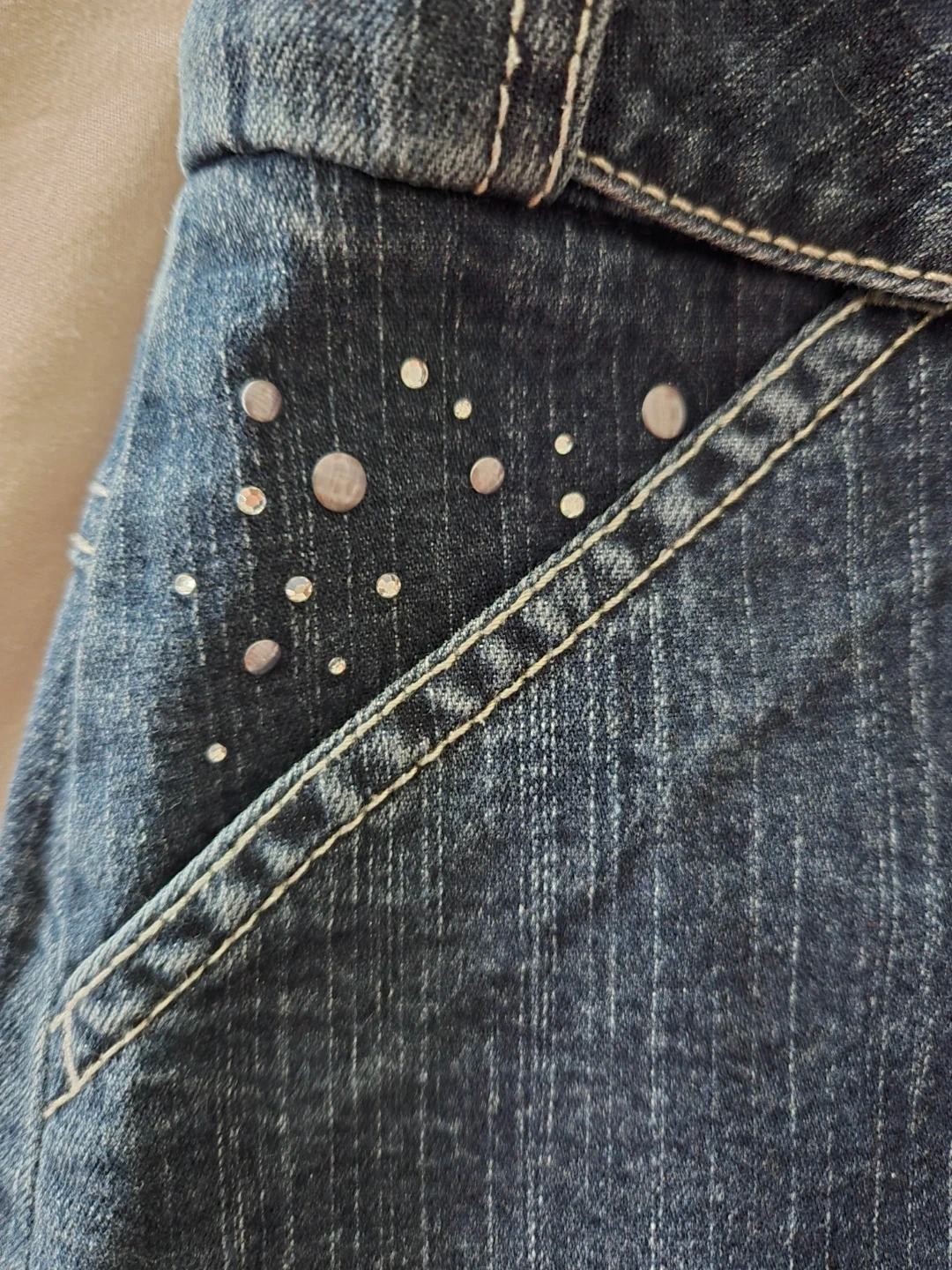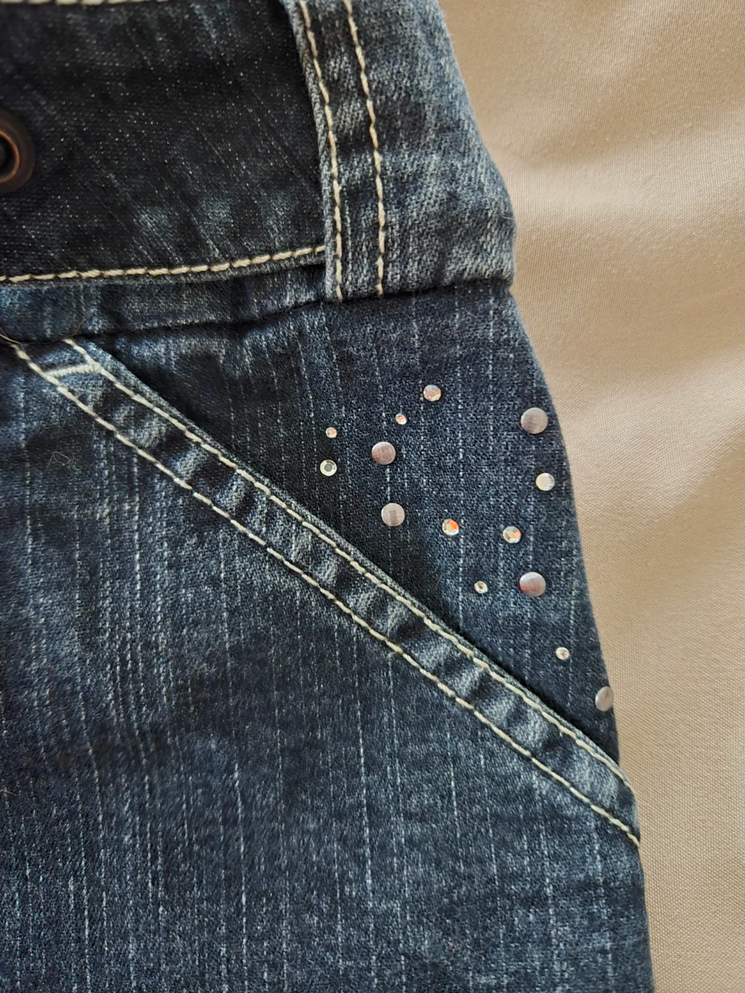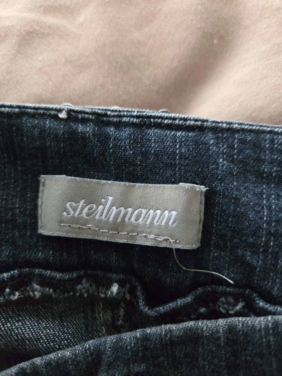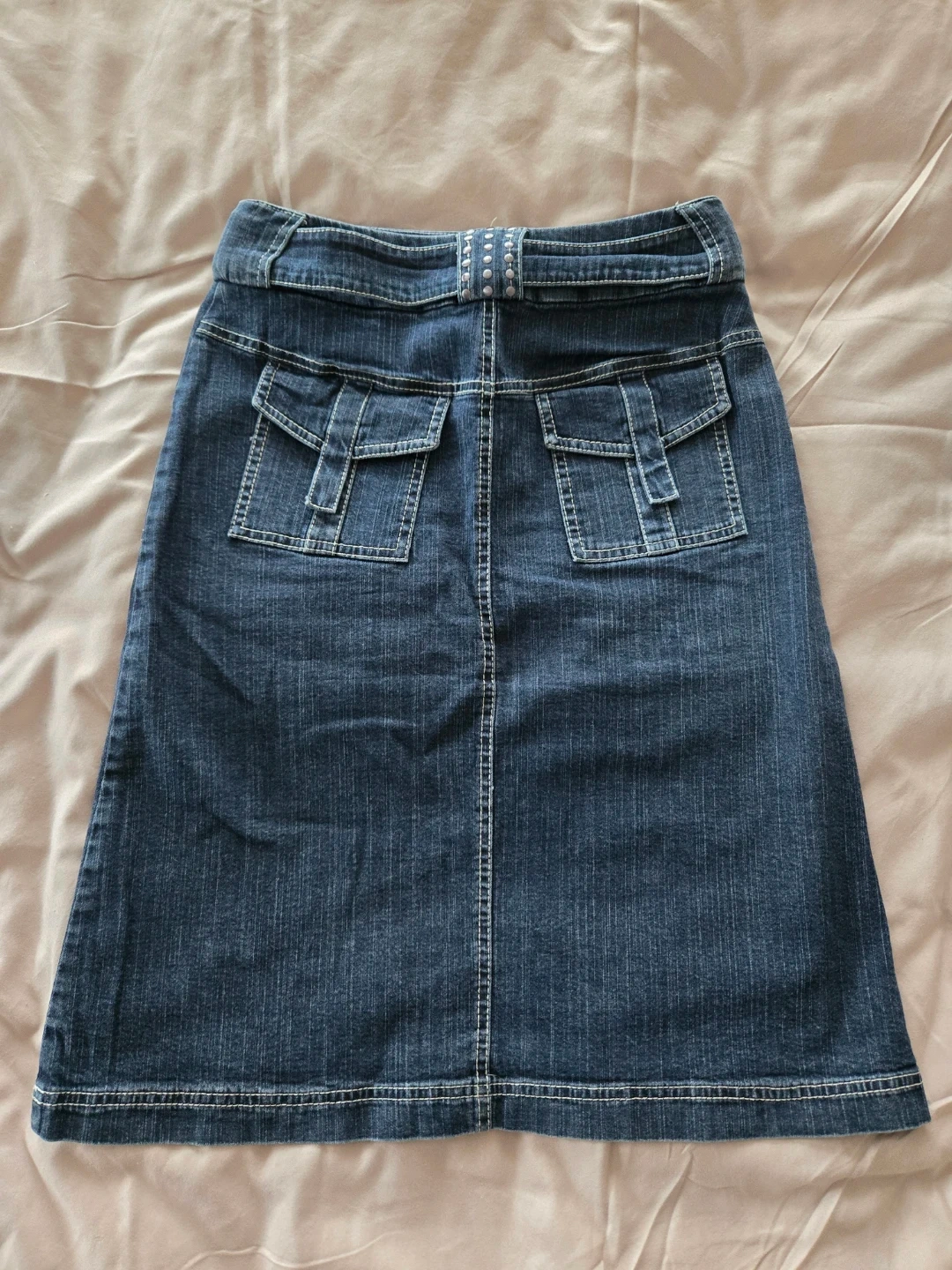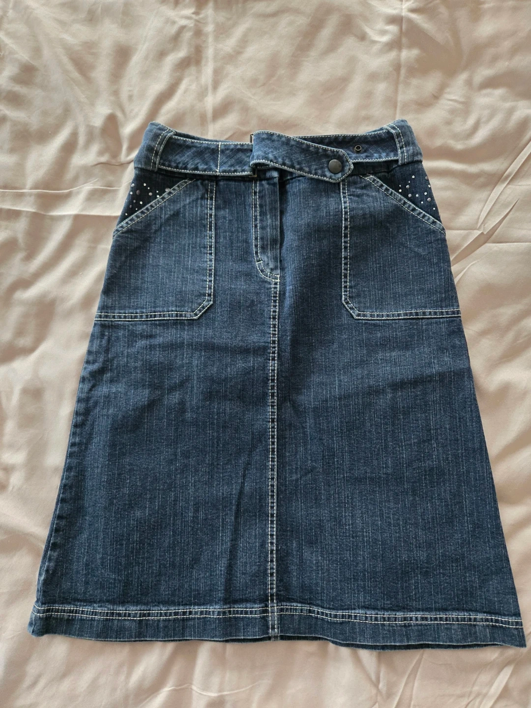 Denim A-Line skirt made of cotton and polyester blend. Steinmann brand. It features denim belt, decorative stitching and embellishments. Size medium to large. Knee length.