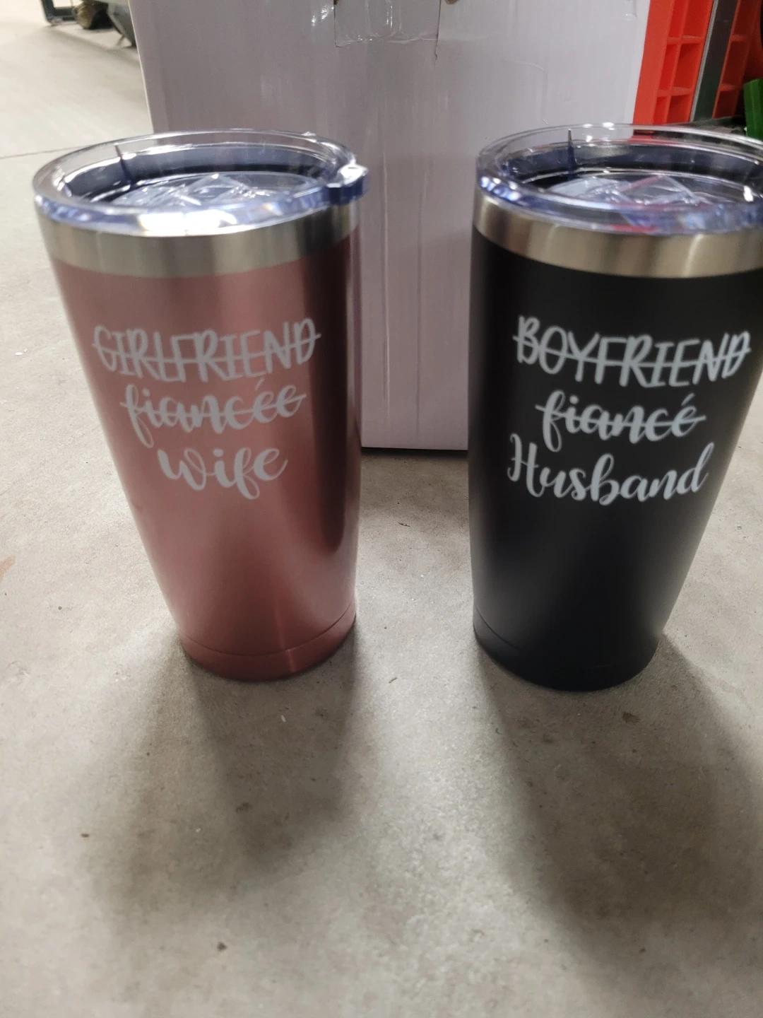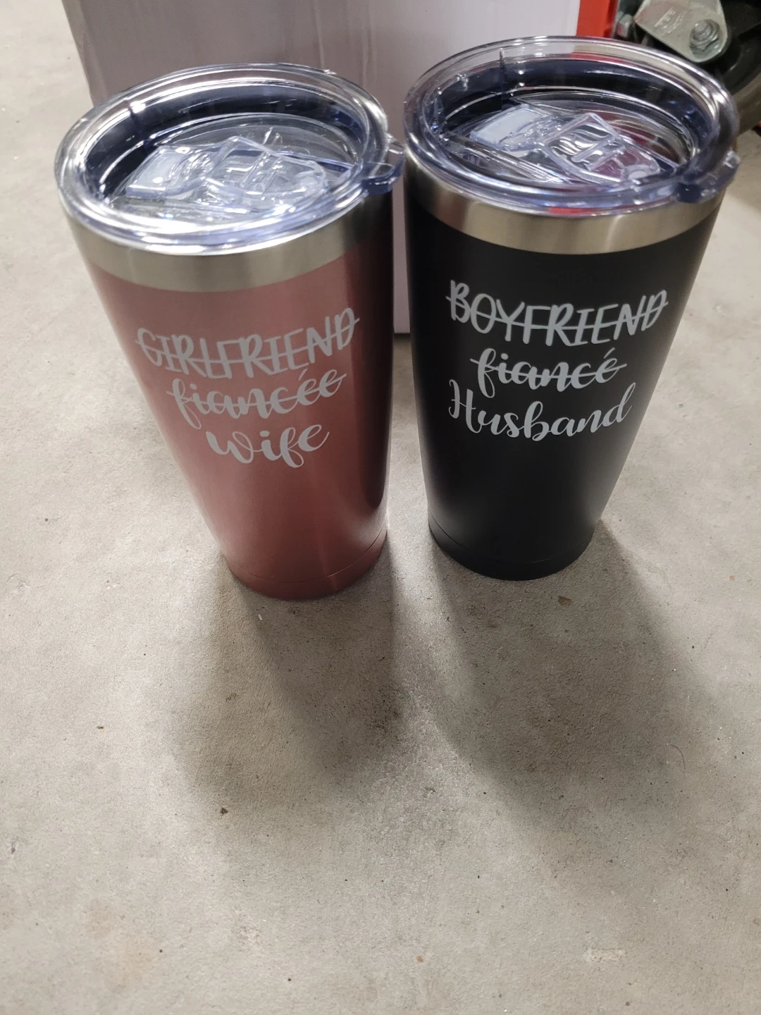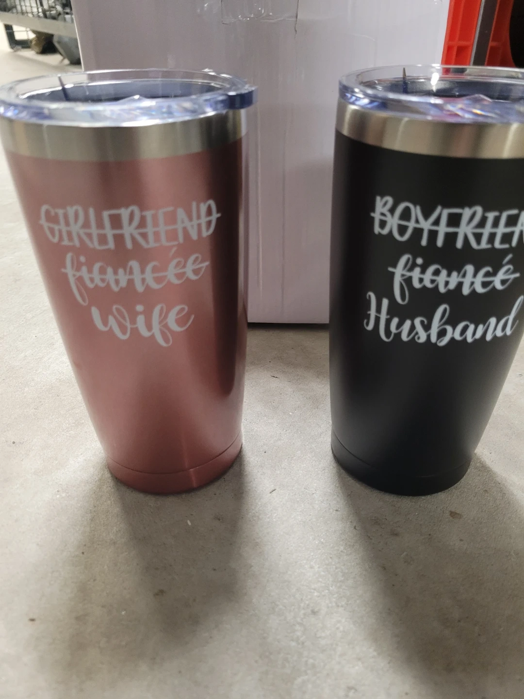 Two insulated tumblers, one rose gold and one black. They're labelled "Girlfriend, fiancé, wife" and "Boyfriend, fiancé, husband". Stainless steel construction.