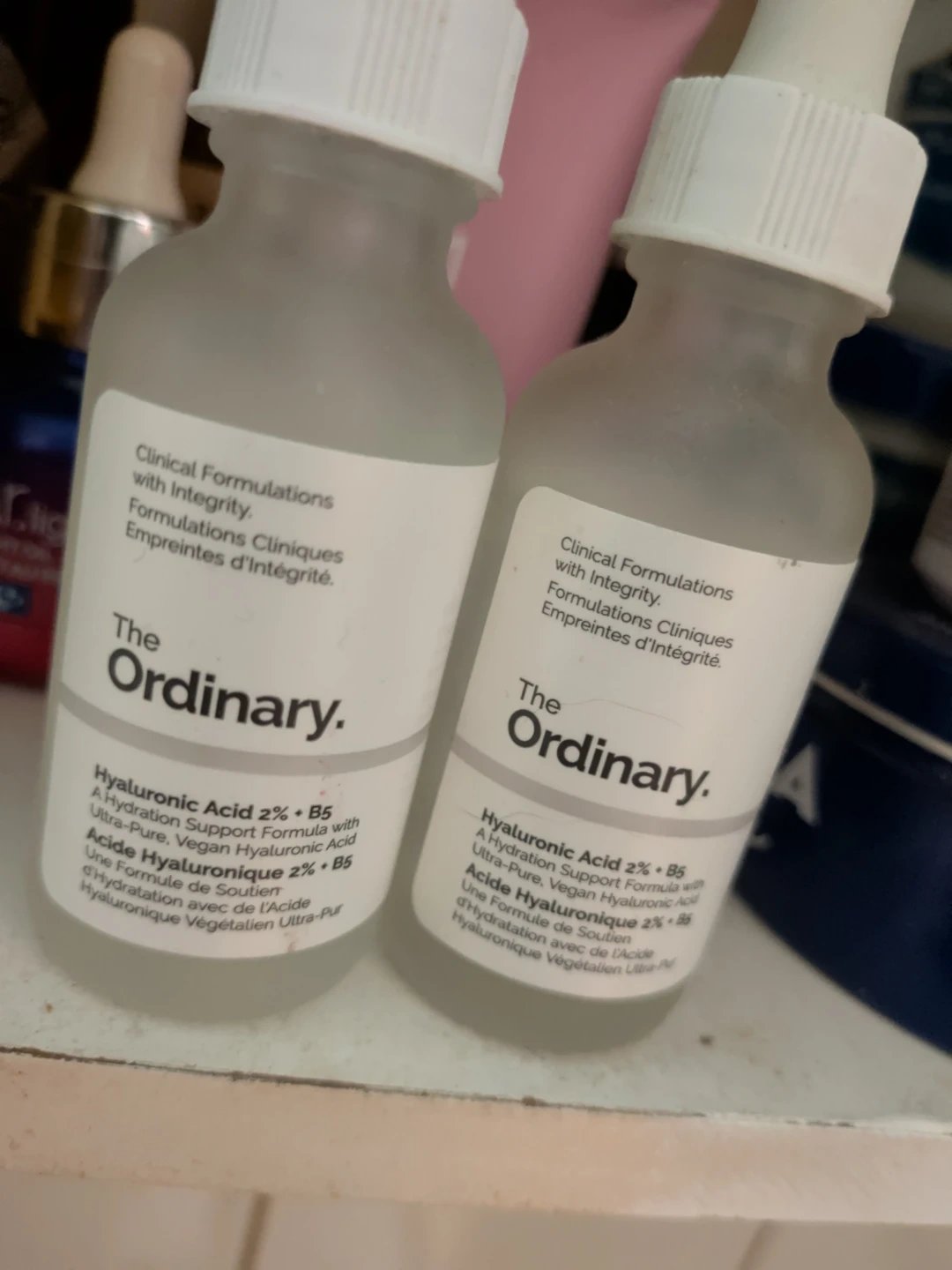 Two bottles of The Ordinary's Hyaluronic Acid 2% + B5. This formula provides surface hydration with ultra-pure, vegan hyaluronic acid and vitamin B5. It's great for supporting skin hydration. Yes they are both full