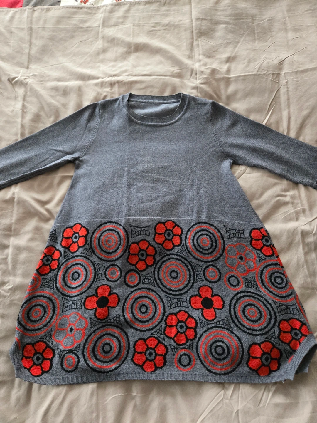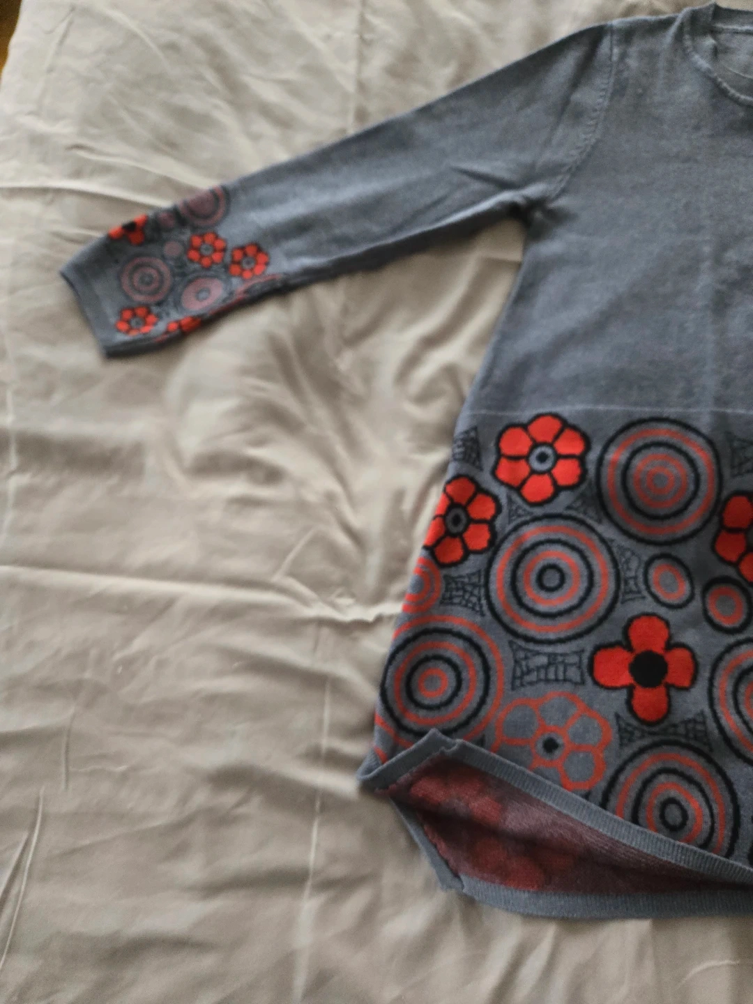 Grey long-sleeved sweater A-Line dress. It features a colourful floral and circle pattern at the hem and on the sleeves. Made from 65% cotton and 35% polyester. This dress is suitable for cooler weather. Knee-length. Size M.