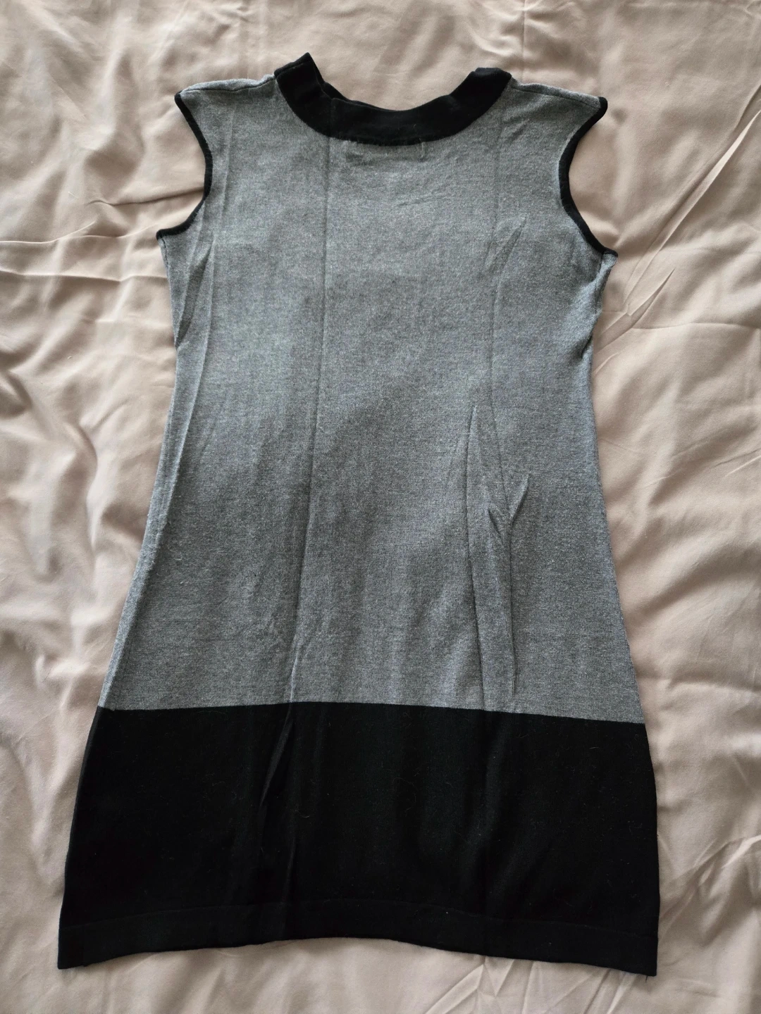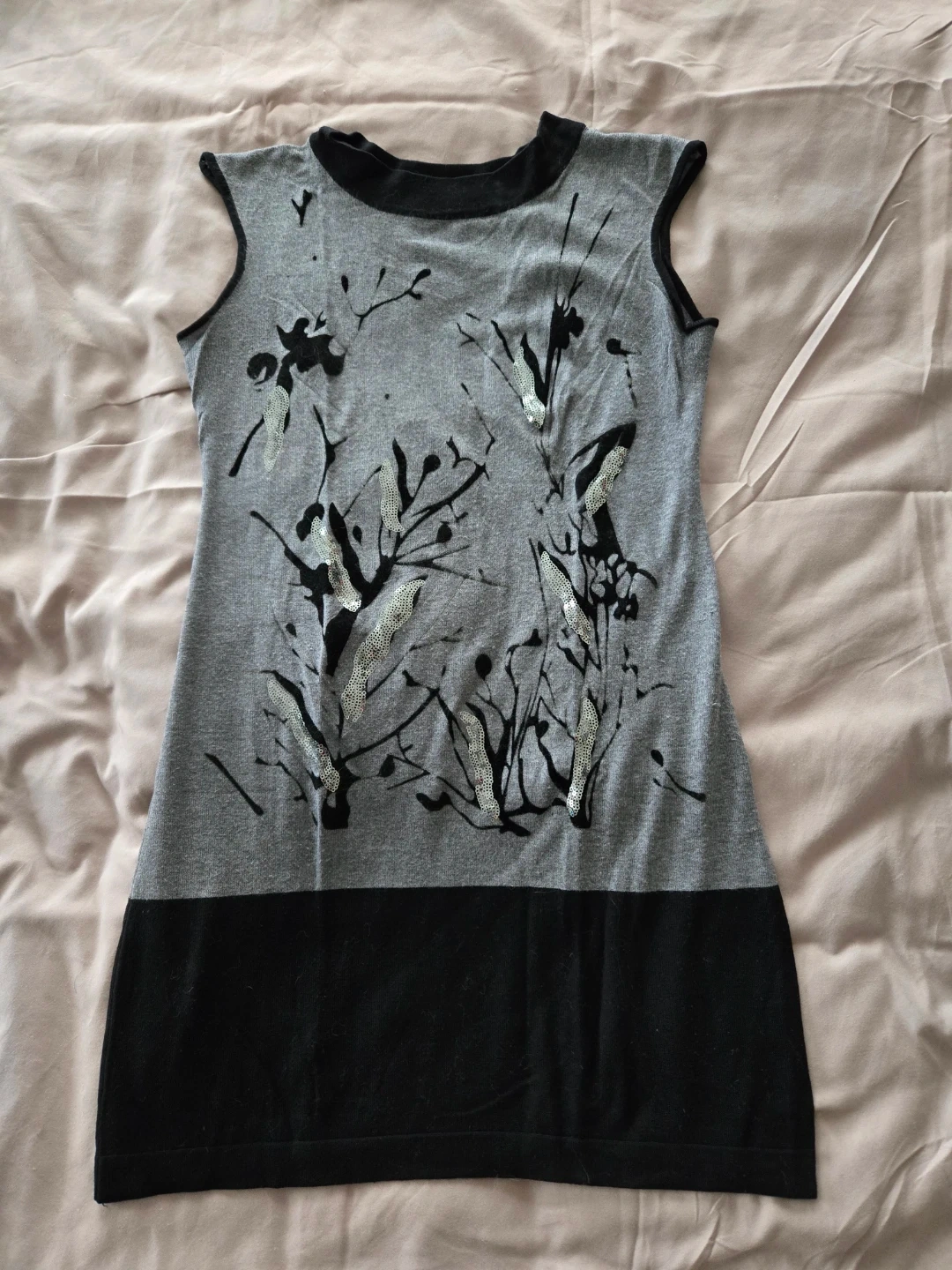 Grey and black sleeveless knit dress with a graphic print and sequins. It's made of 83% viscose and 17% nylon. Size medium.