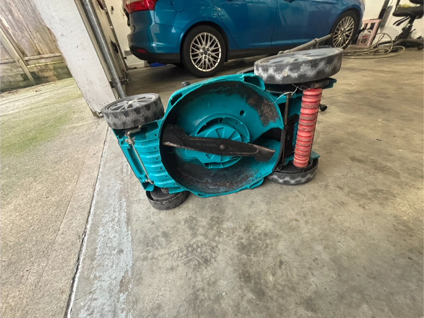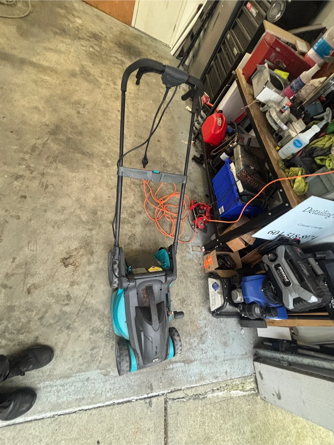 This is a teal and black Bosch electric lawn mower. It comes with a cord for operation. It's designed for easy grass cutting. Good condition we upgraded to gas so no need for this one