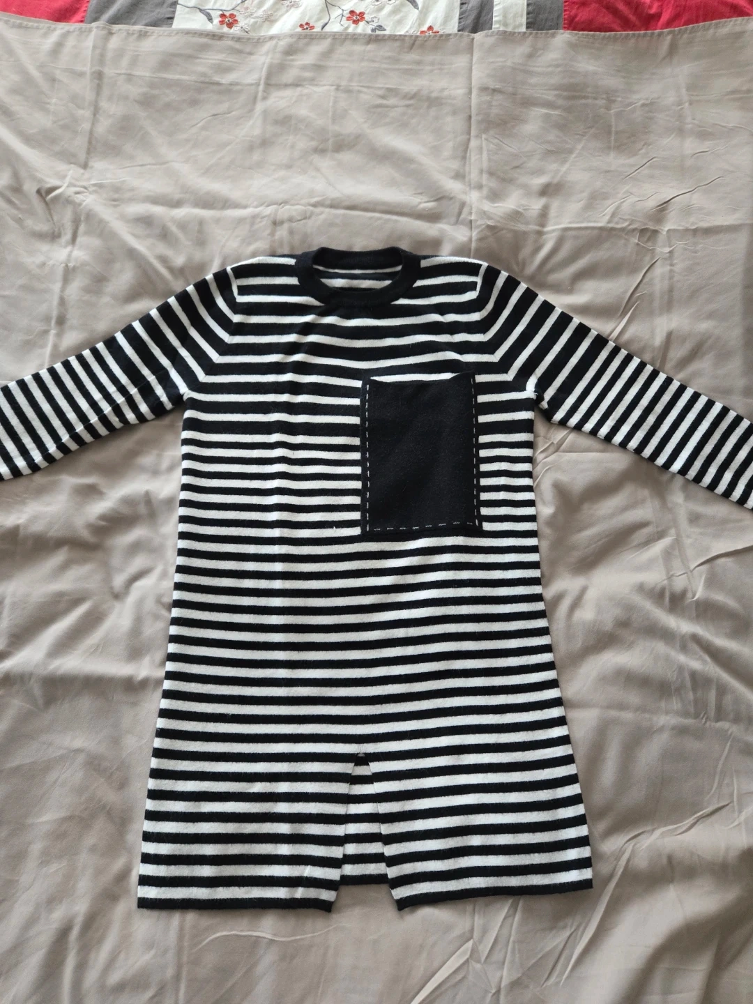 A black and white striped long-sleeve knit tube dress. It has a front chest pocket with stitched detailing. There's a slit at the hem for ease of movement. Above-knee length.
