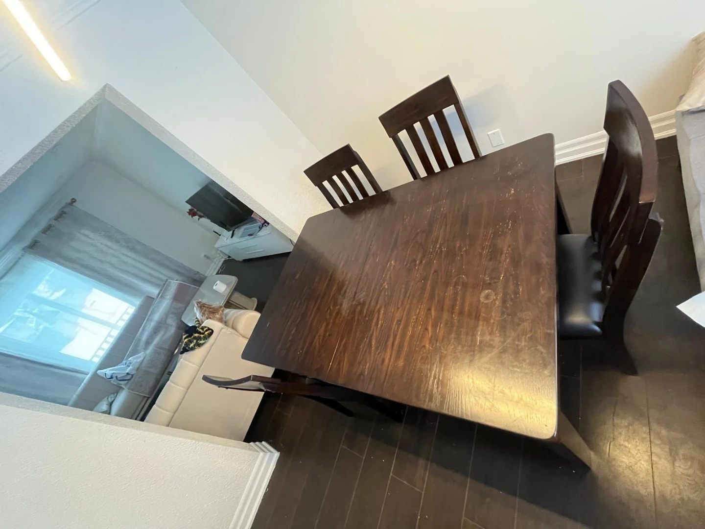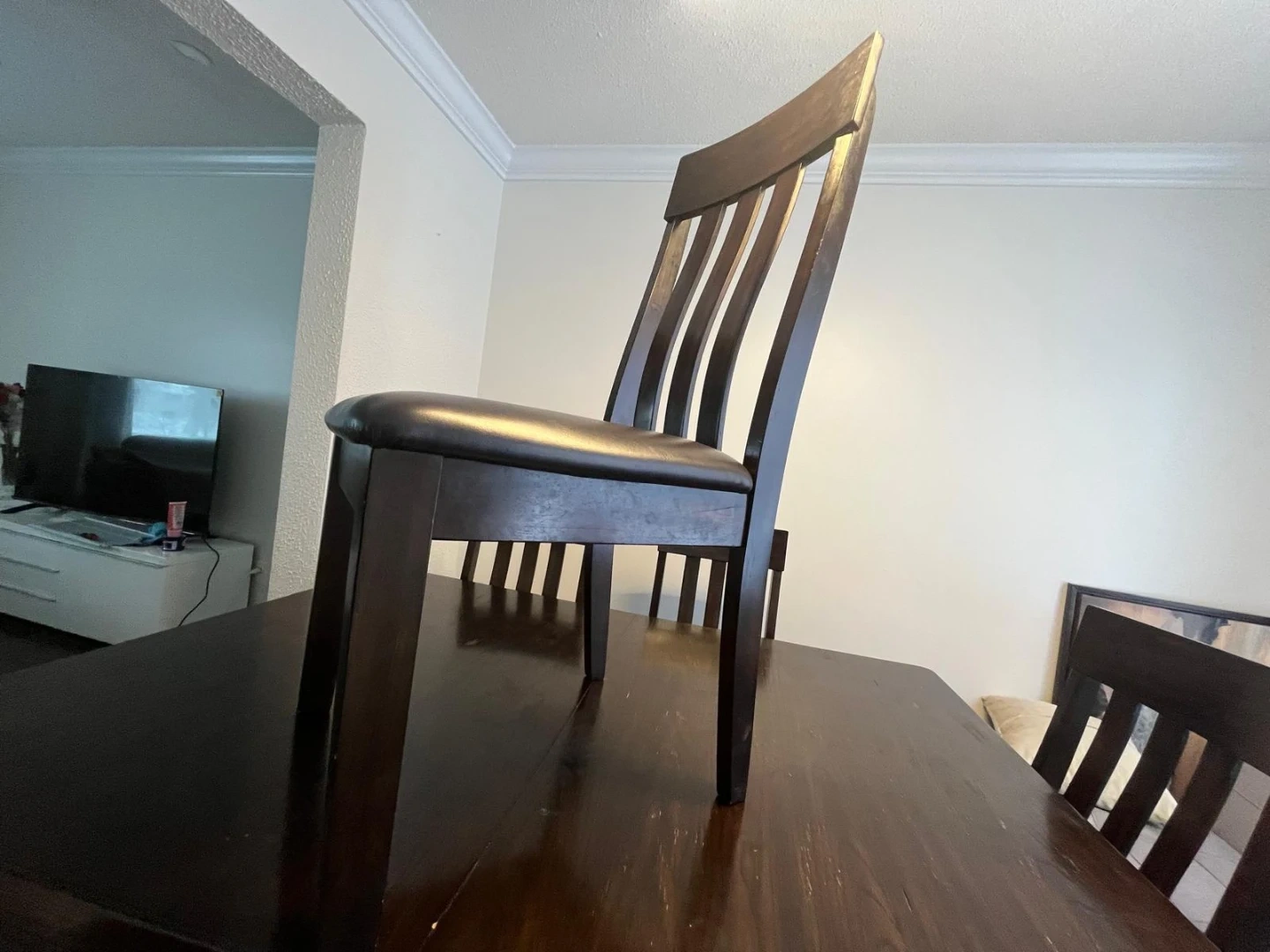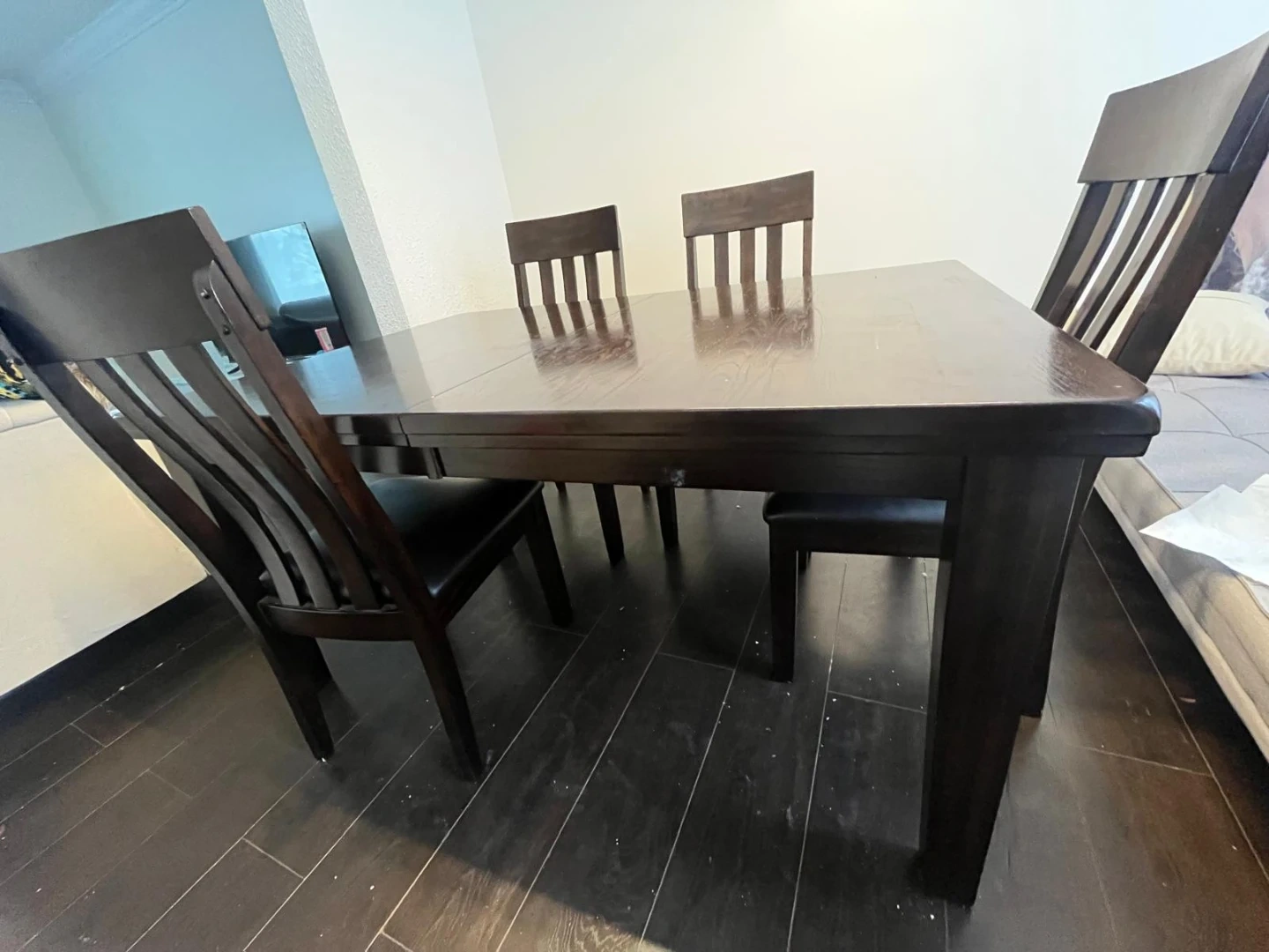Solid Wood Dining table n chair with a dark brown finish and a comfortable padded seat. Bought from Ashley Store. Sturdy construction suitable for everyday use.Minor scratches on table.