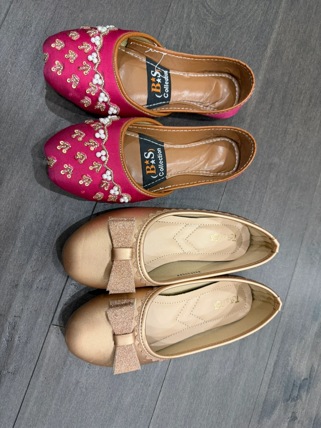 A pair of embellished fuchsia flats with beads and sequins, and a pair of gold flats with glitter bows. Both have decorative stitching. These flats are great for adding a touch of sparkle to any outfit!