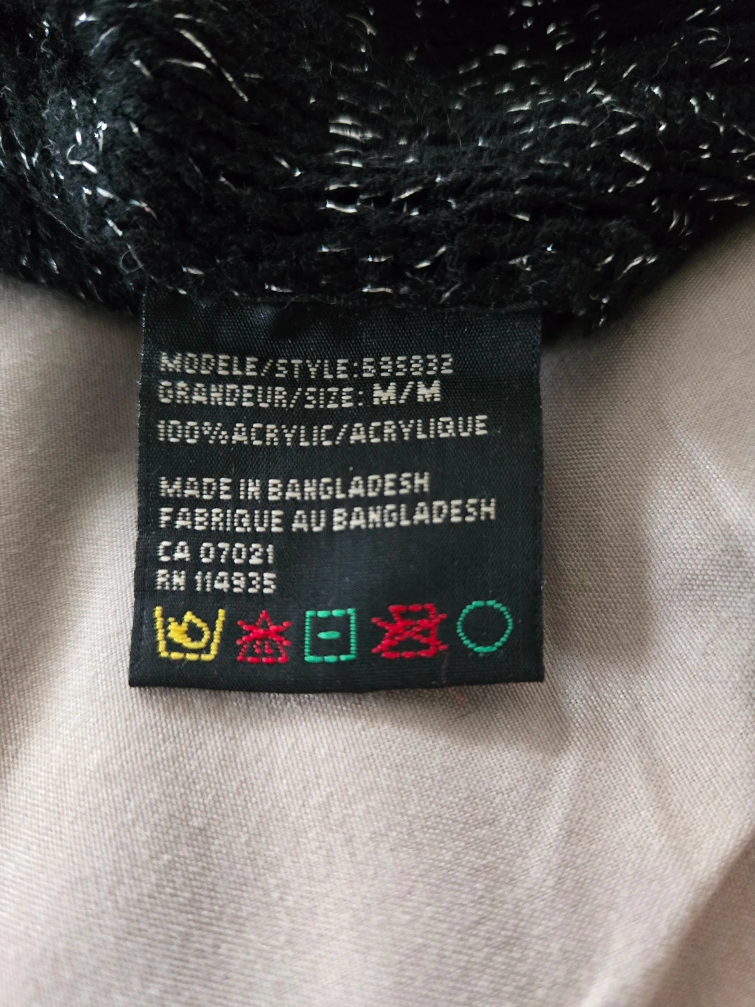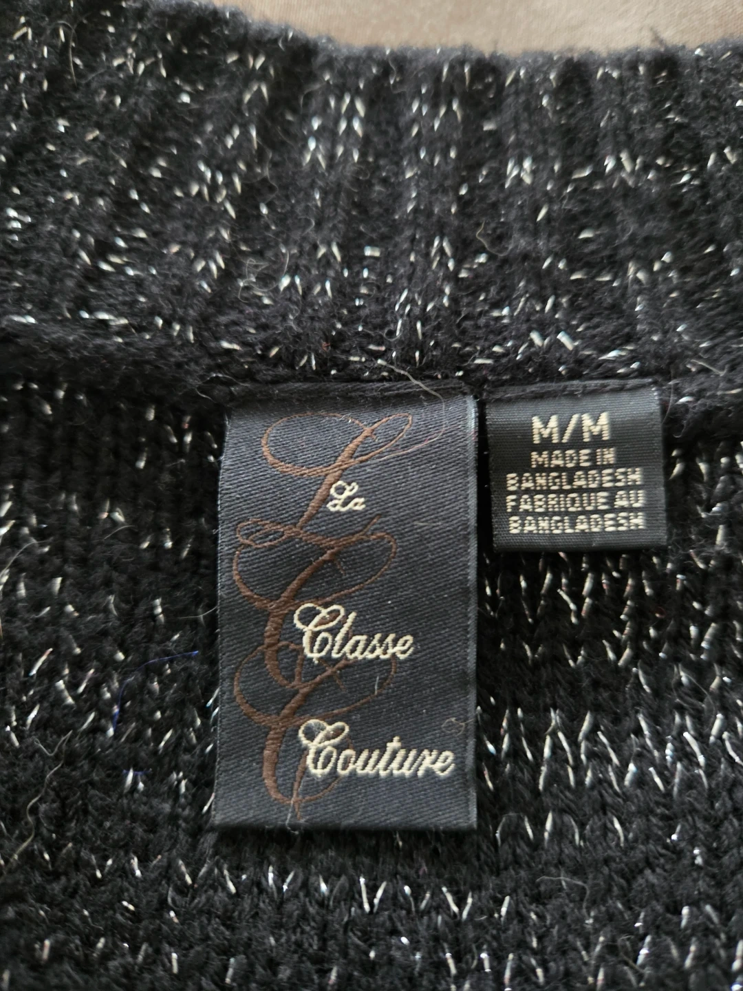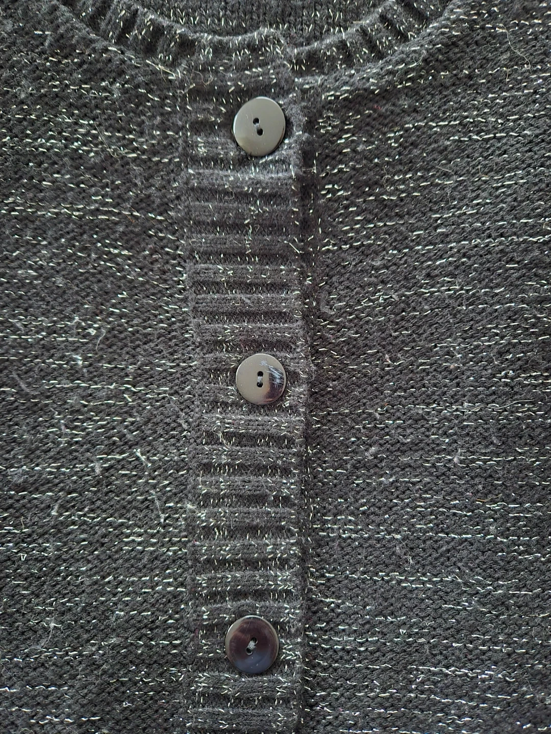 Le Classe Couture cardigan in black with a sparkle thread. Made of 100% acrylic. Features a button-up front and short sleeves. Size M/M.