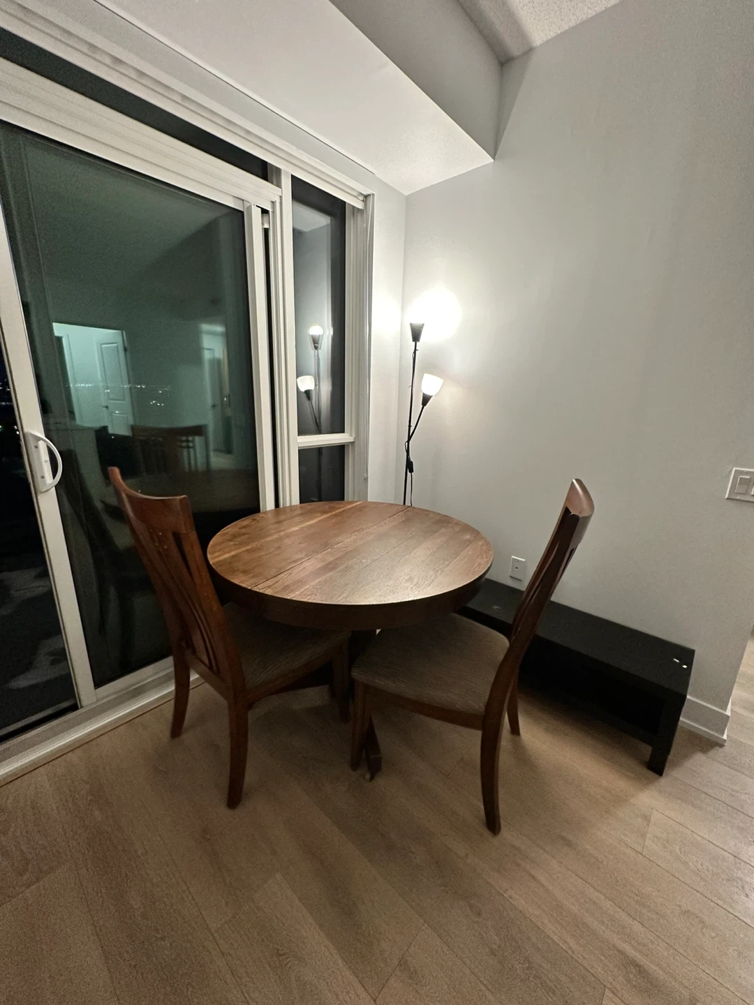 A round wood dining table with matching chairs. The chairs have upholstered seats and wooden frames. It's a nice set for a smaller dining area.