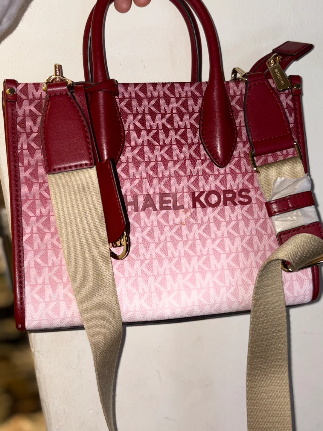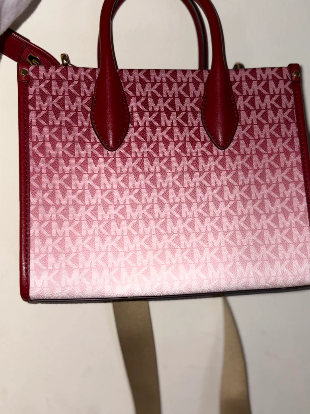 This is a Michael Kors tote bag with the MK signature pattern in a pink ombre design. It features burgundy leather trim and handles. Comes with a detachable crossbody strap.