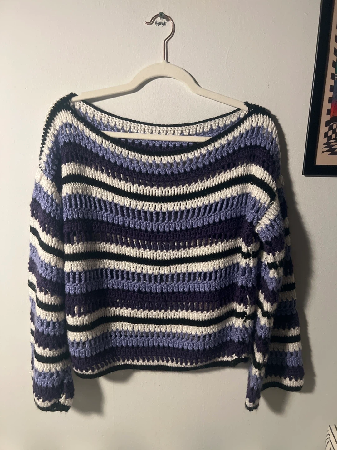 Striped crocheted sweater with a boat neckline. Made with a blend of acrylic and cotton yarns in shades of purple, white, and black. It's a handmade piece perfect for layering.