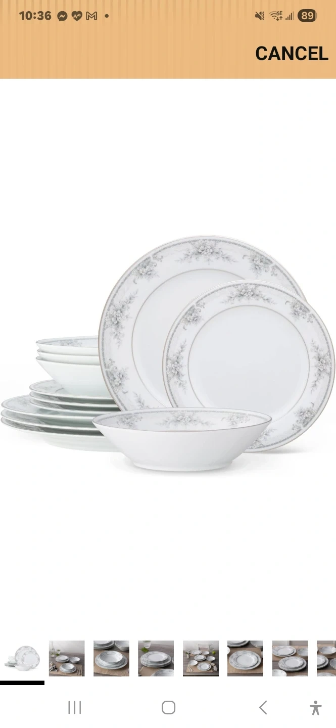 White porcelain dinnerware set featuring a delicate floral and vine pattern with a silver trim. It's made for everyday use or special occasions. This set includes plates and bowls.
