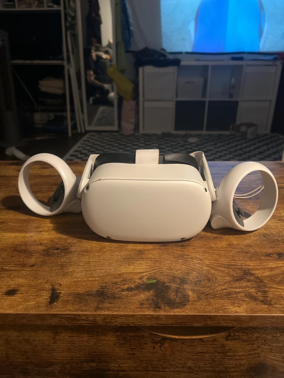 This is an Oculus Quest 2 virtual reality headset with its controllers. It's white and comes with the necessary straps for comfortable wear. It's perfect for immersive gaming experiences.