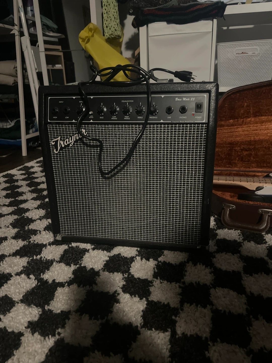 This is a Traynor Bass Mate 25 bass amplifier. It features equalization controls for bass, low middle, and high middle. It also has presence and volume knobs. Includes a line out and a headphone jack for private practice.