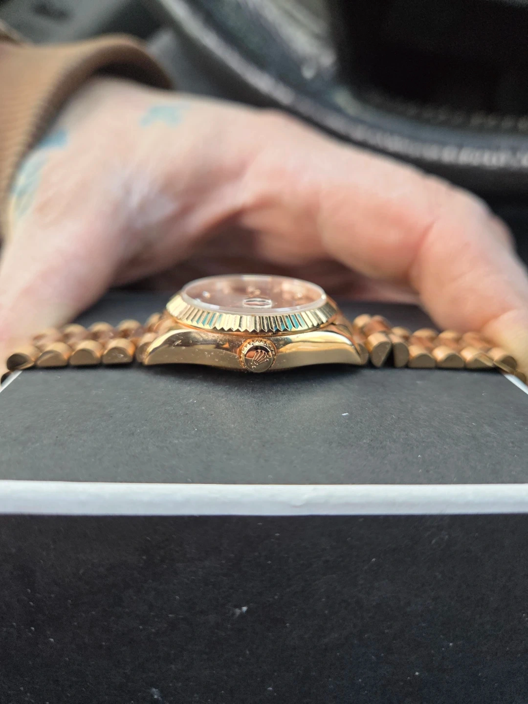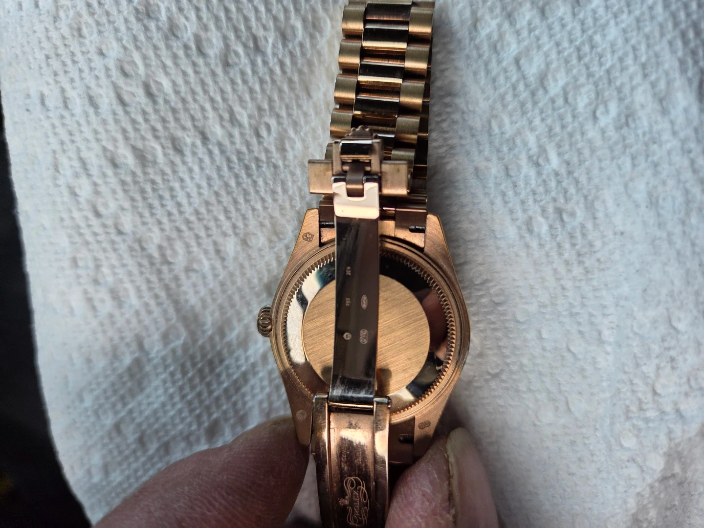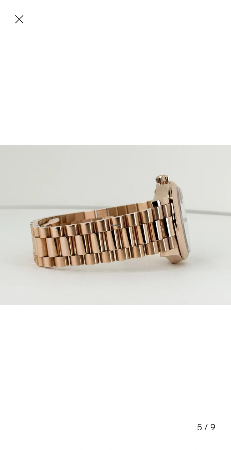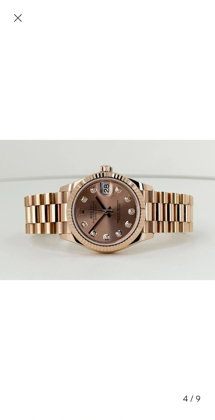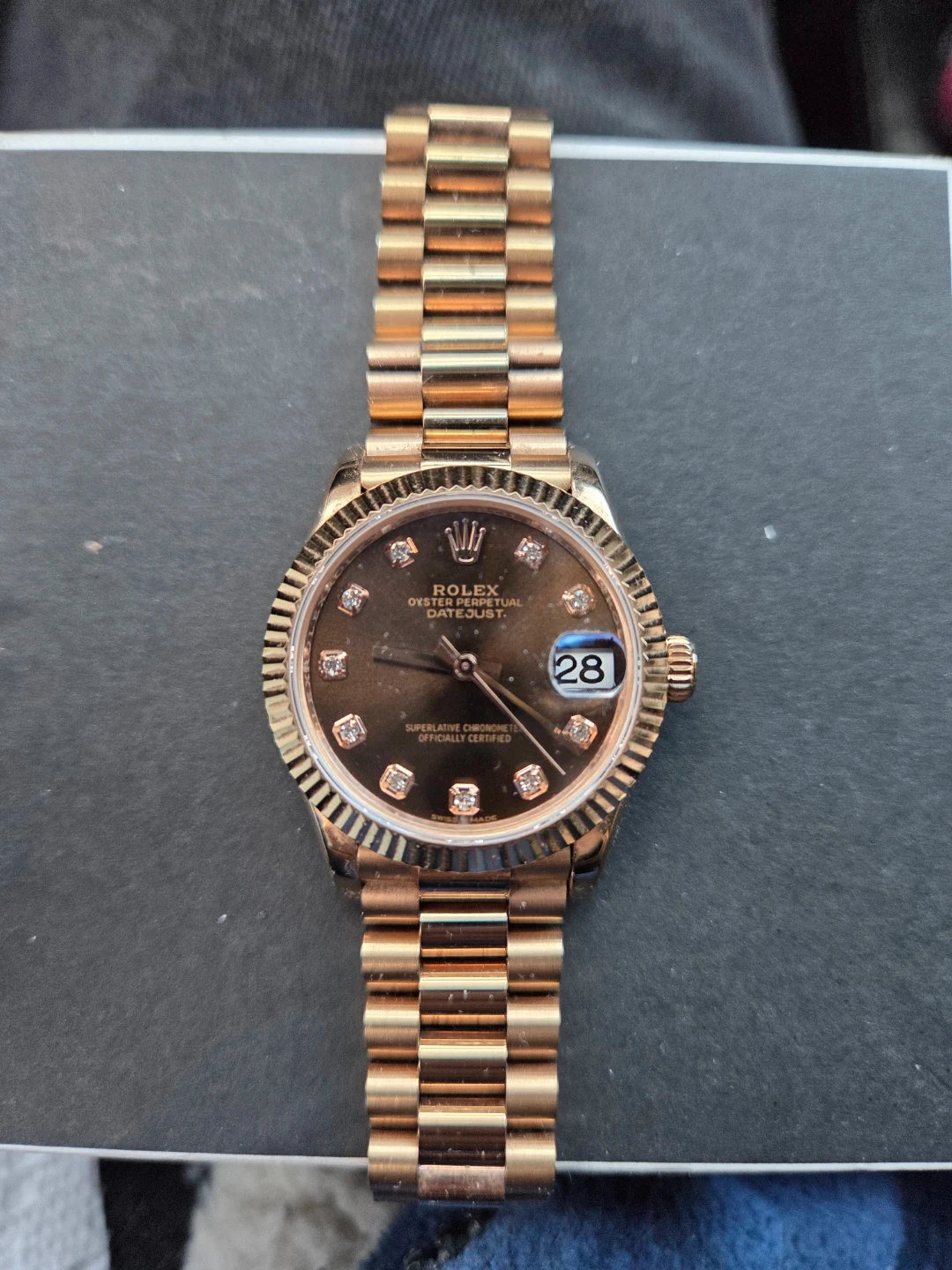 This Datejust woman's watch is 18 ct Everose gold features a chocolate, diamond-set dial and a President bracelet.