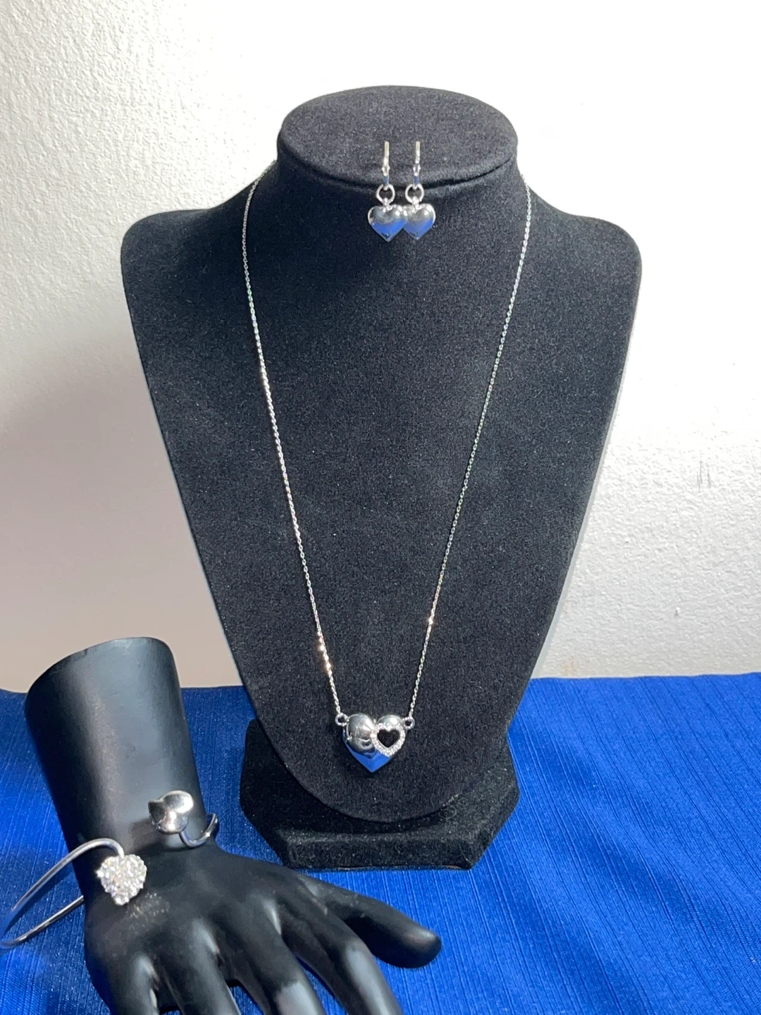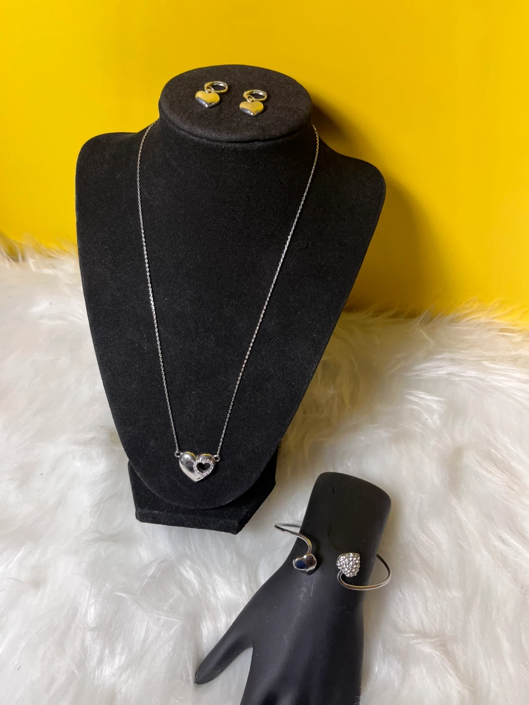 A lovely three-piece jewellery set featuring heart-shaped pendants and sparkling accents. The set includes a Lia Sophia Pendant necklace, a pair of earrings, and a matching bracelet. It's a great way to add a touch of charm to any outfit!