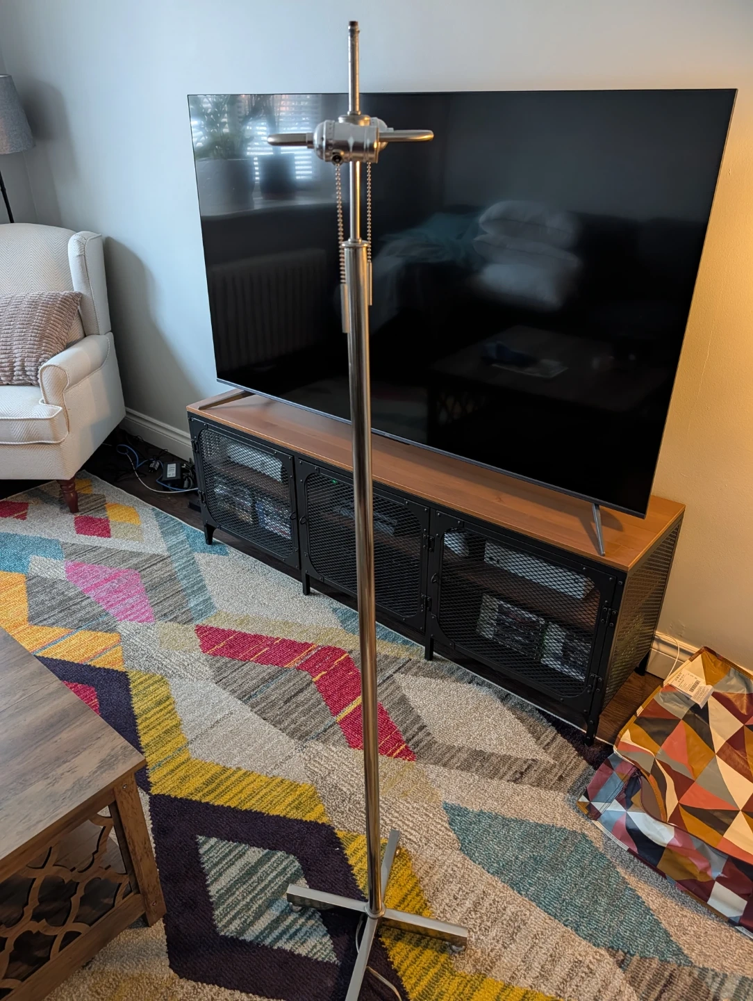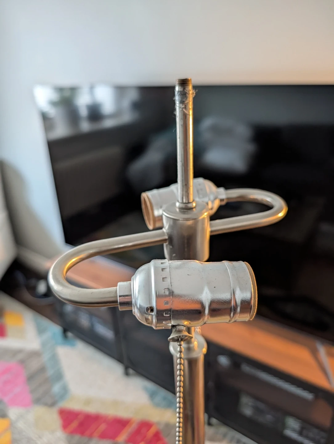 This floor lamp features a stylish drum shade and a very sturdy metal base. It has a dual-socket fixture for two bulbs. It's perfect for adding ambient lighting to any room. I lost the harp during moving so comes as is and you will need to buy one separately. The lower price reflects this.
