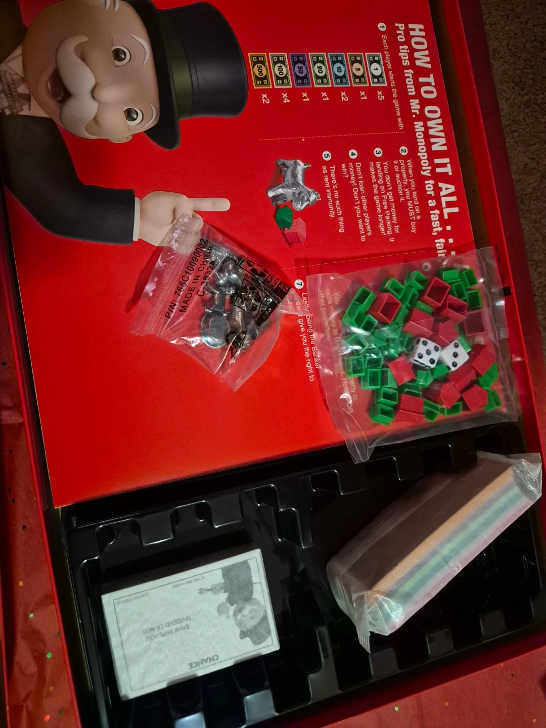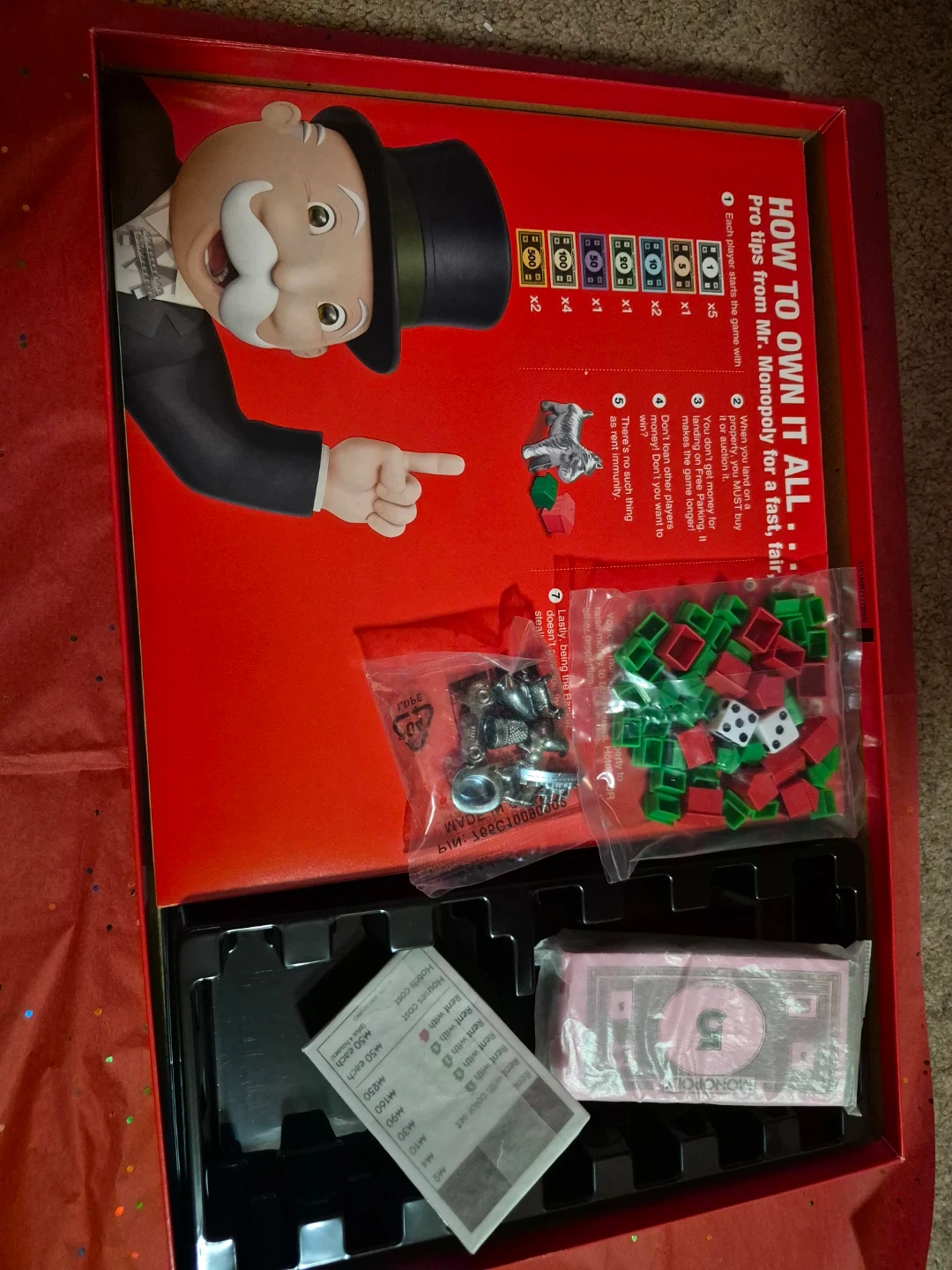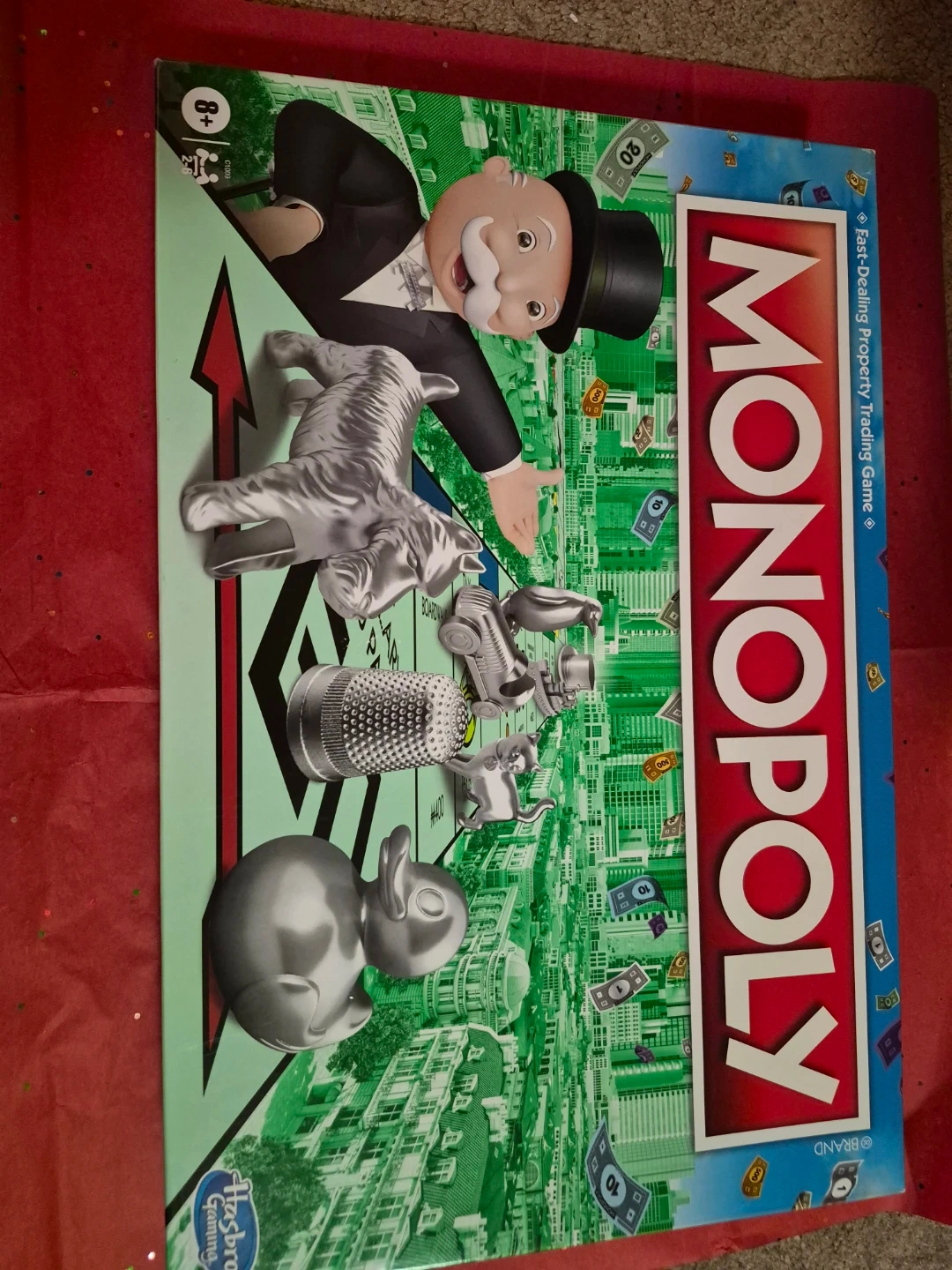 Classic Monopoly board game with all tokens, dice, houses, and money included. It's the fast-dealing property trading game everyone knows and loves. Perfect for family game nights! 8+ everything is in its original bag. Completely new.