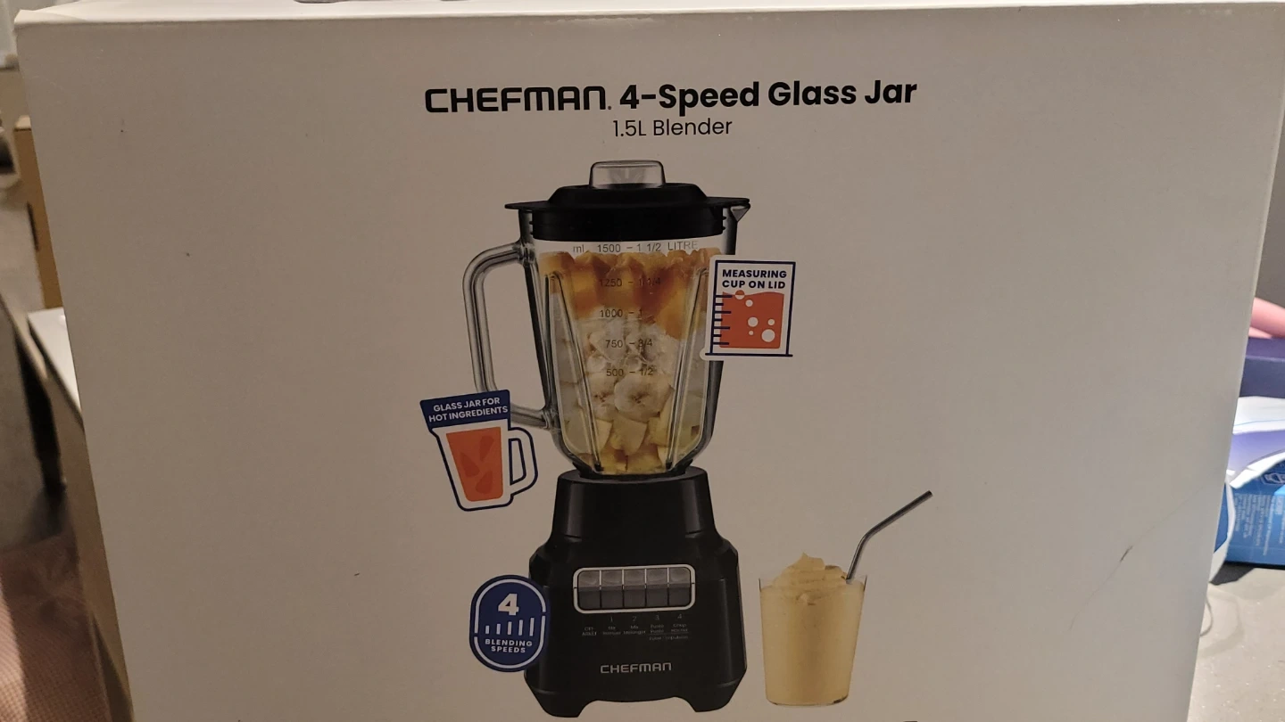 This Chefman blender comes with a 1.5L glass jar that's safe for hot ingredients. It has 4 blending speeds and a measuring cup on the lid. Makes smoothies and more!