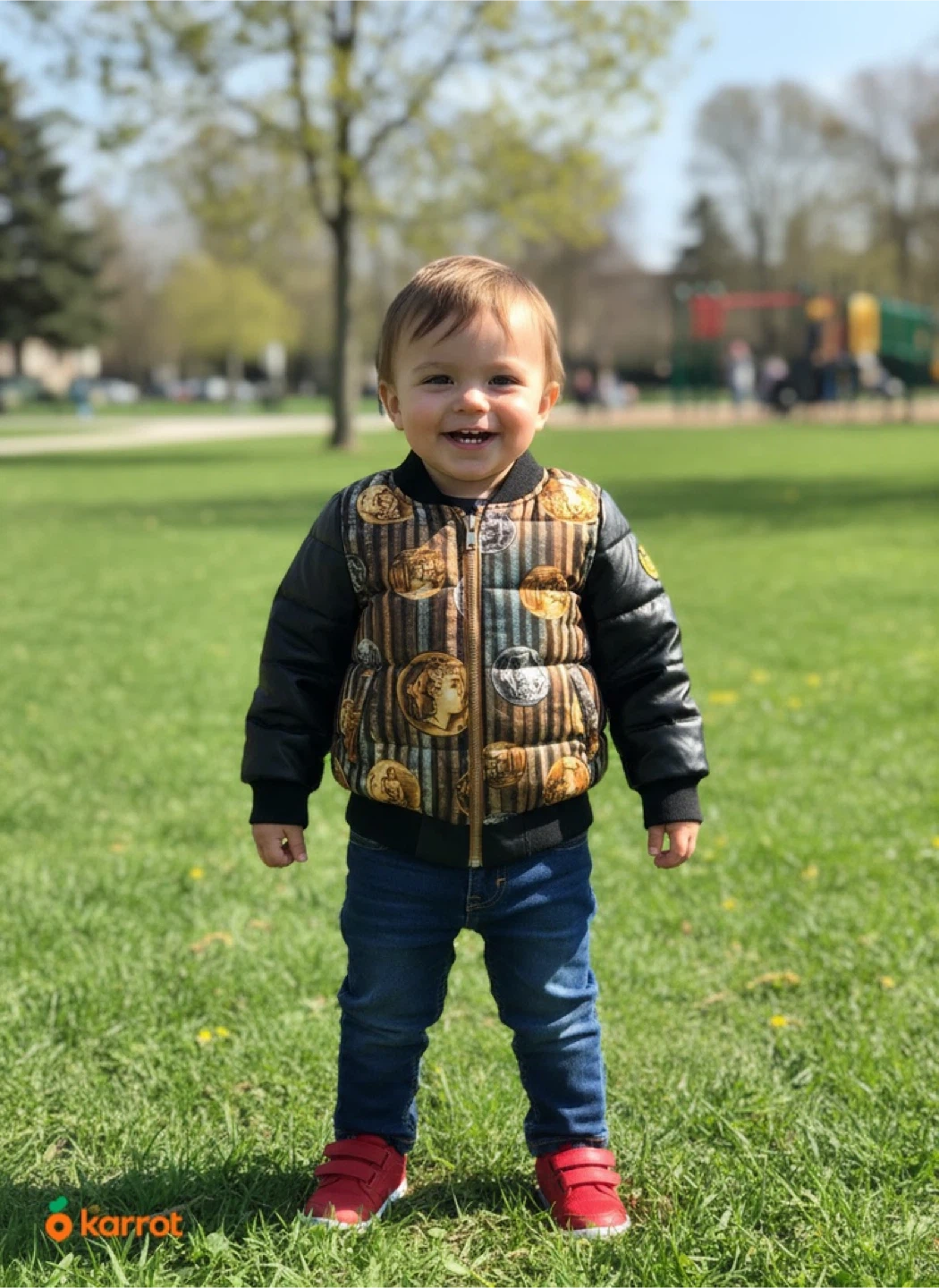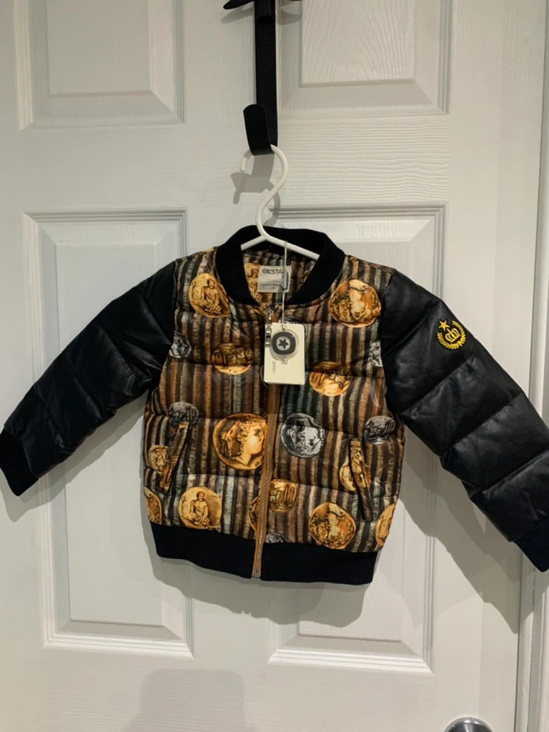 This KSTAR children's bomber jacket has a unique coin and scroll pattern on the body with black faux leather sleeves. It's a size 100. This jacket is perfect for keeping your little one warm and stylish during cooler weather!
