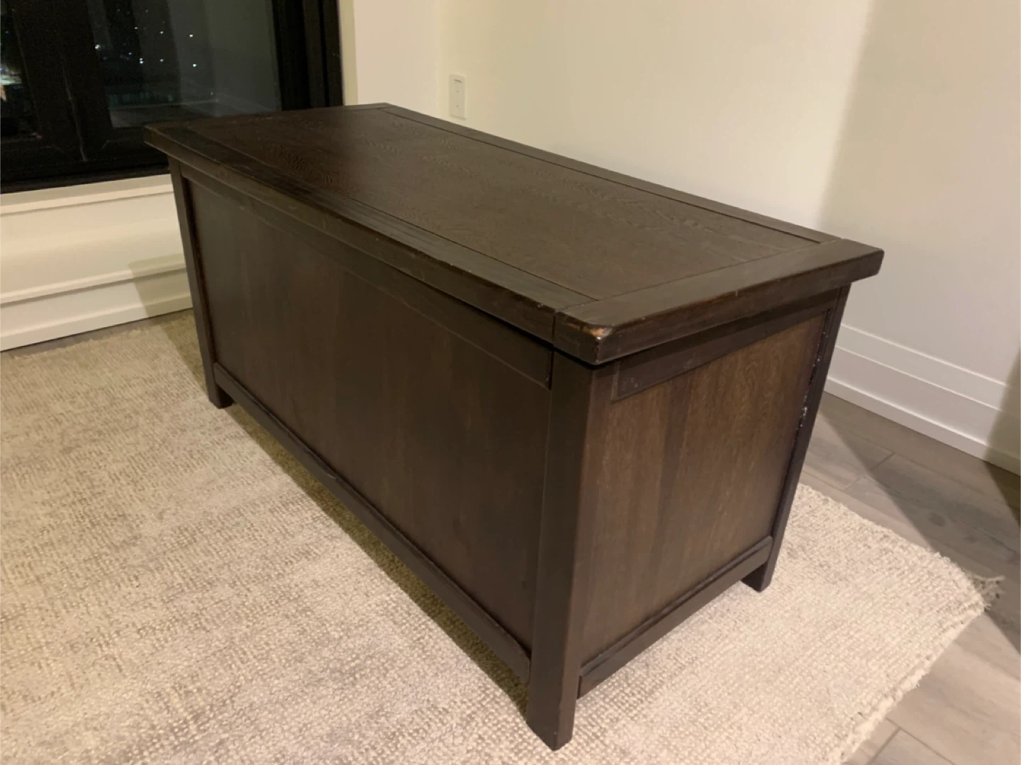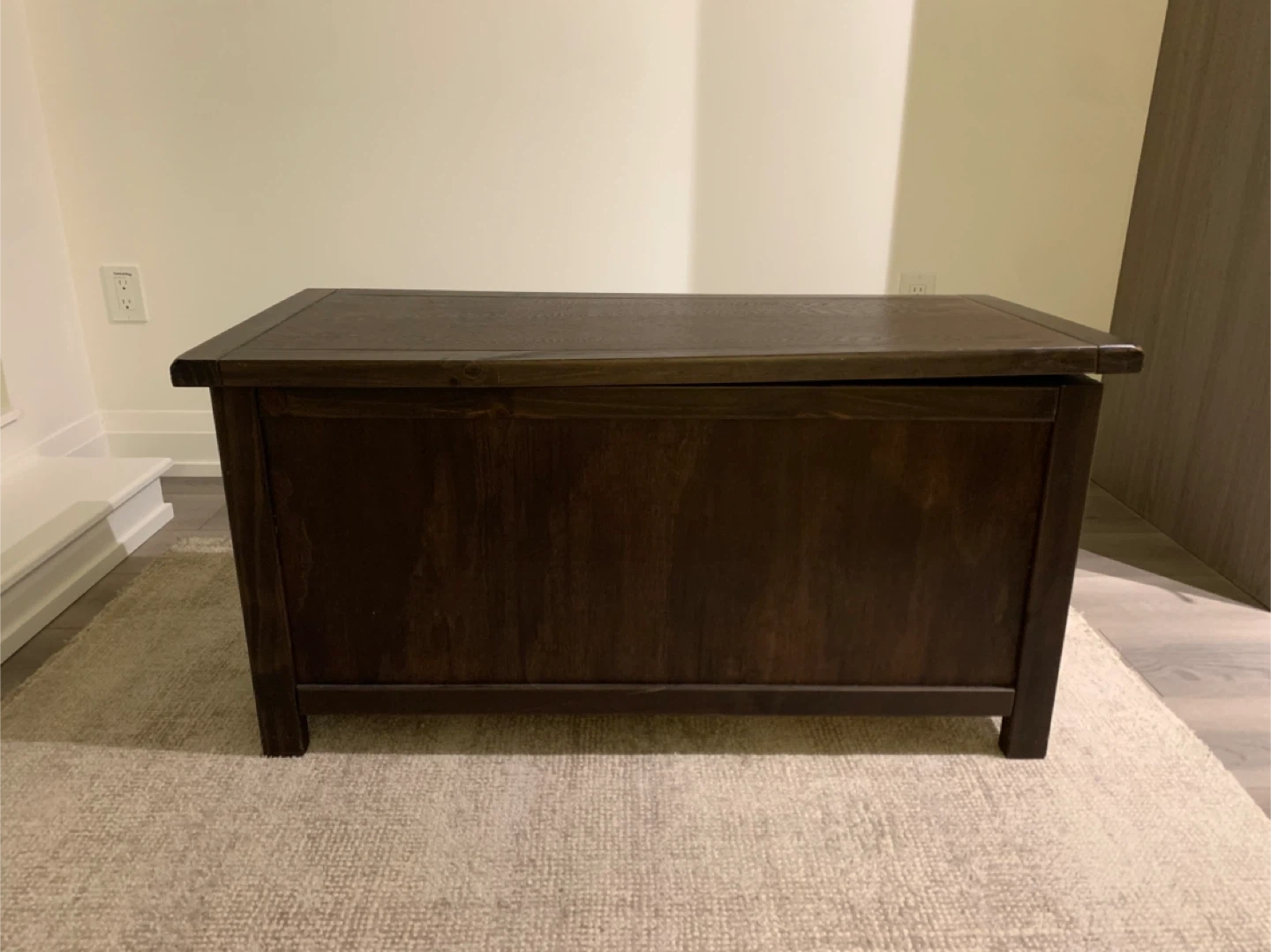 Dark wood finish storage chest with lift-top lid. Great for storing blankets, pillows, toys, shoes, or other household items. Can also be used as an entryway bench or extra seating.