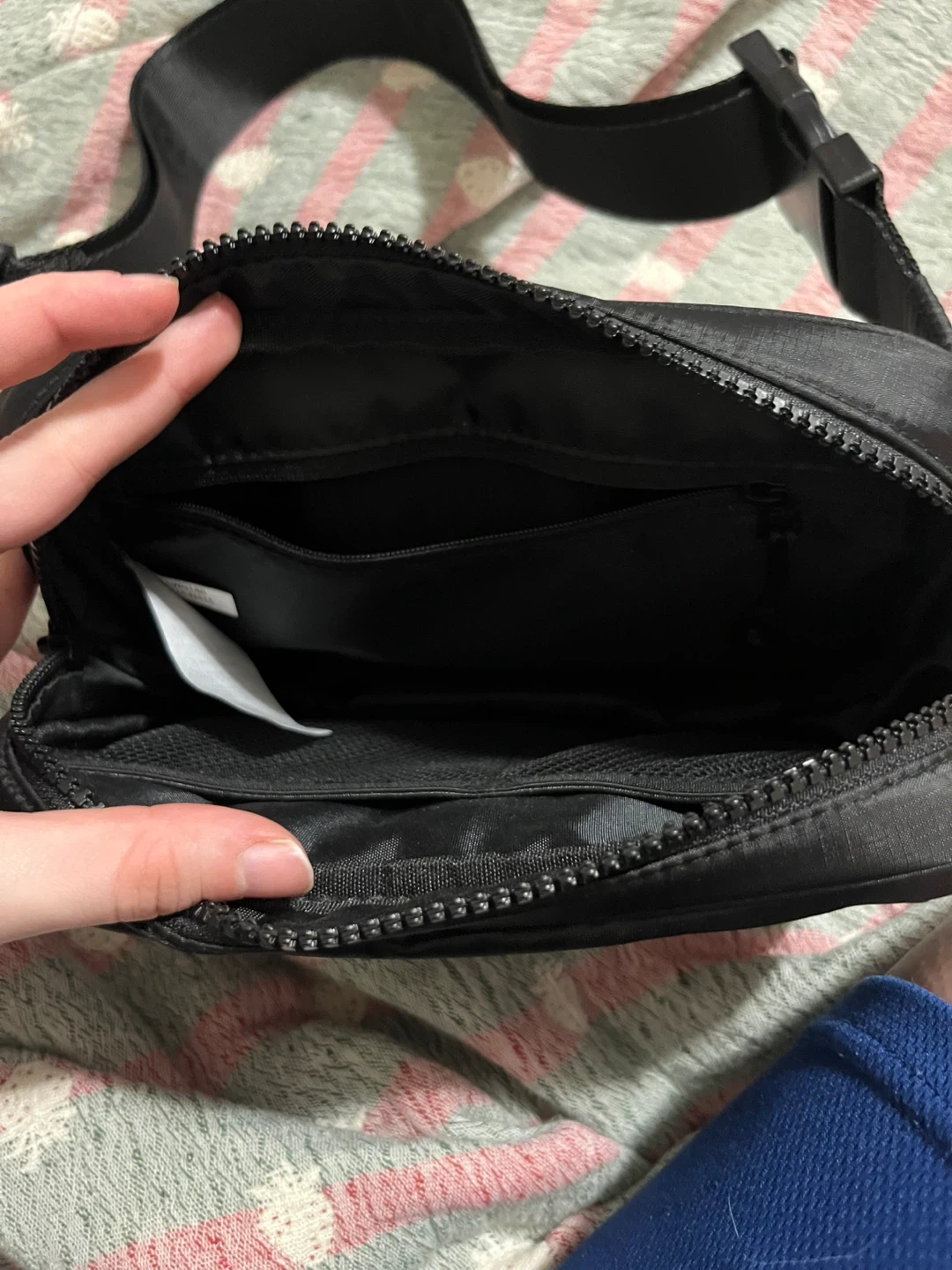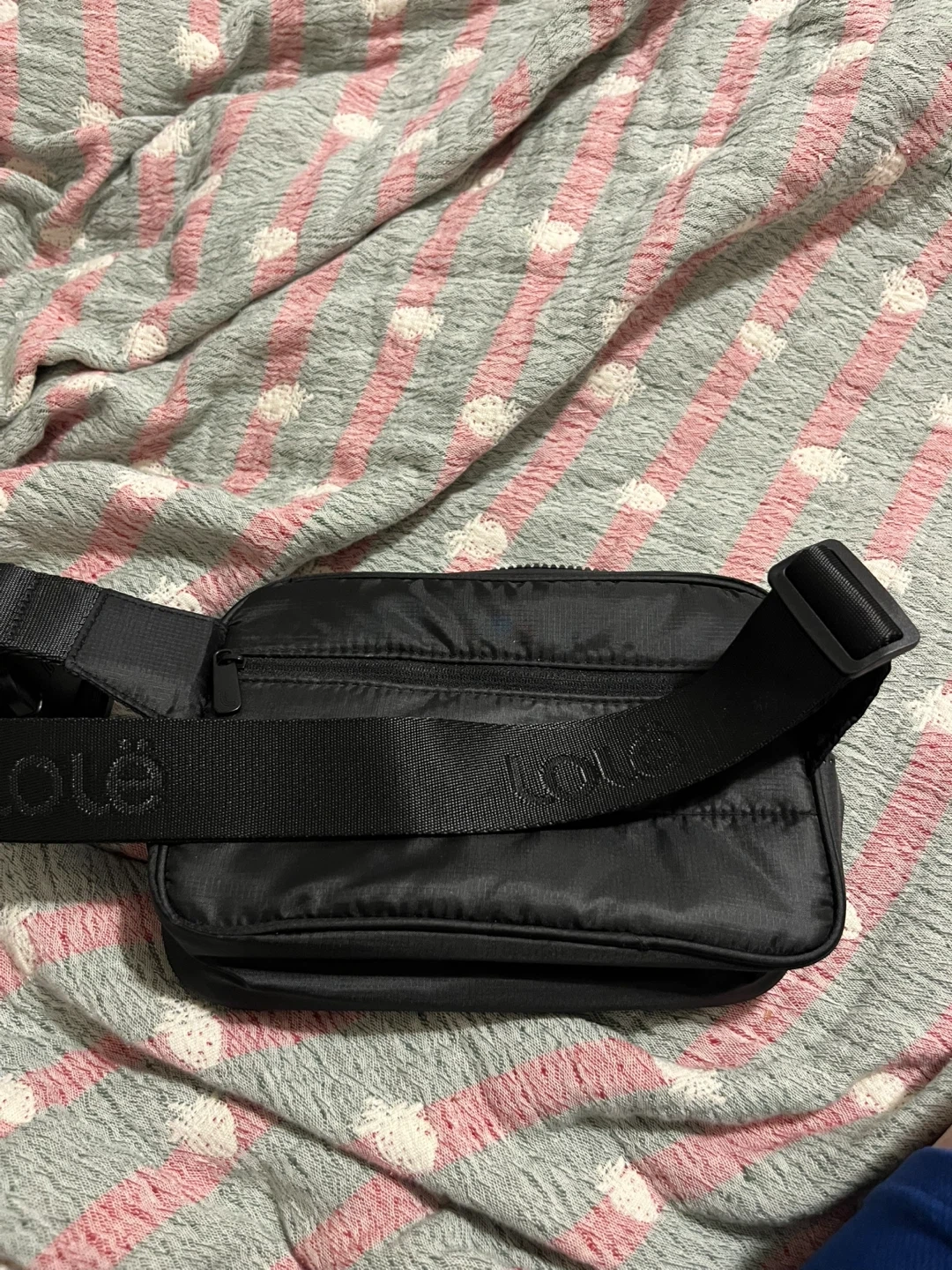 This black Lole belt bag is made from a puffer material. It has multiple interior pockets and an adjustable strap. It's great for keeping essentials organized on the go!