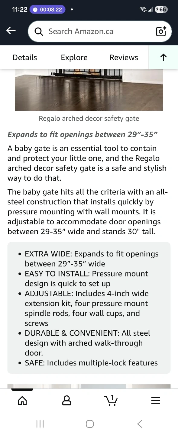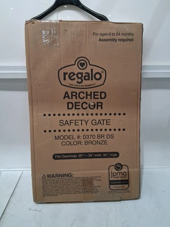 I'm selling a Regalo Arched Decor Safety Gate that expands to fit openings between 29-35 inches wide. It's designed to accommodate door openings and stands 30 inches tall. This gate is new, never installed, ready to keep your little one safe and secure.