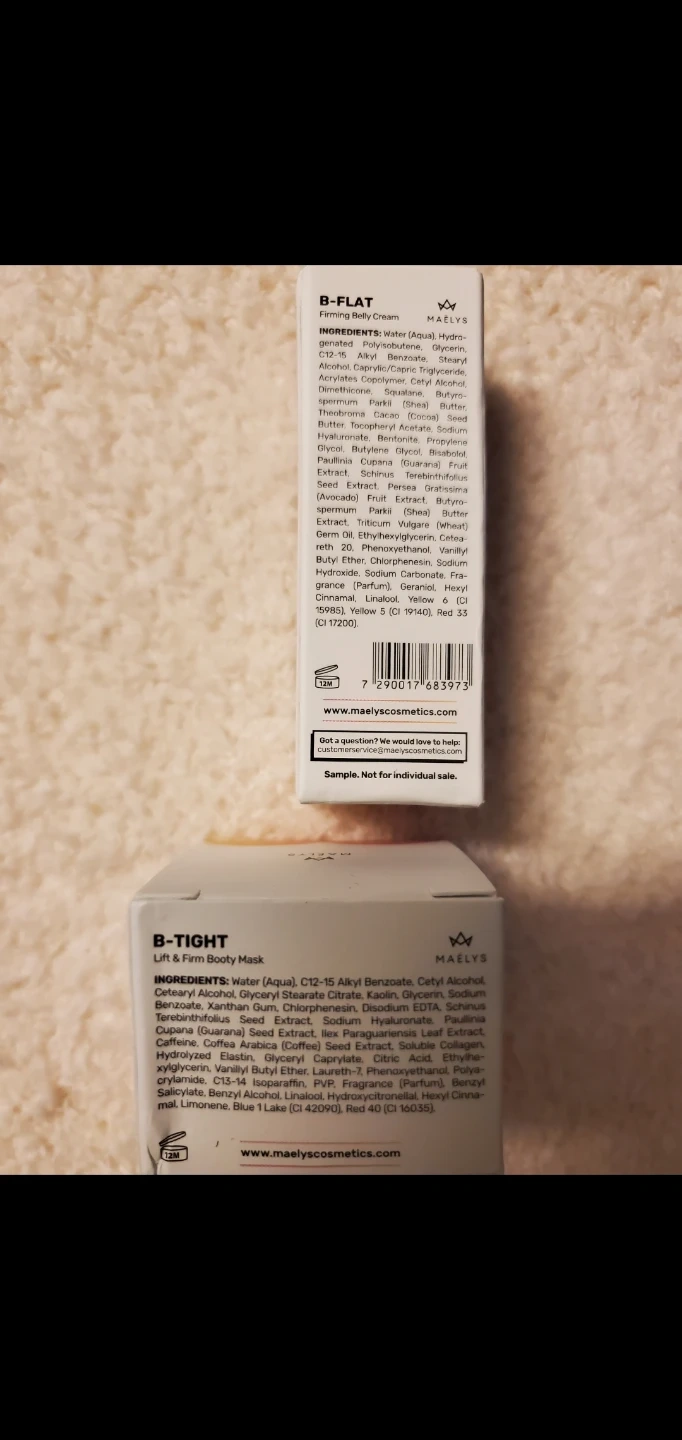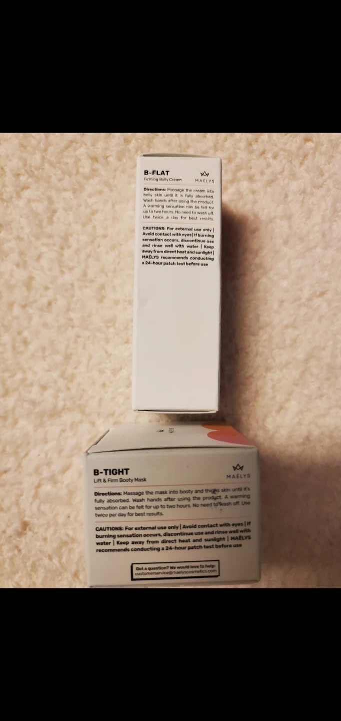This set includes the MAELYS B-FLAT Firming Belly Cream (192g / 6.7 oz) and the MAELYS B-TIGHT Lift & Firm Booty Mask (15 mL / 0.5 Fl. Oz.). They're designed for skin firming and hydration.