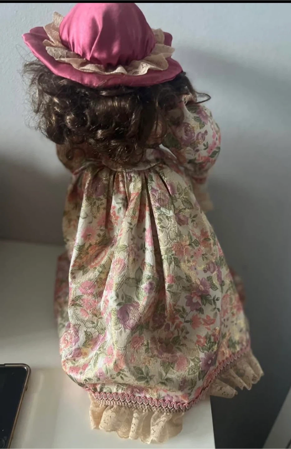 This decorative porcelain doll is dressed in a floral print gown with a ruffled pink hat. It features intricate lace trim and gold chain detailing on its dress. A lovely display piece for any collector!
