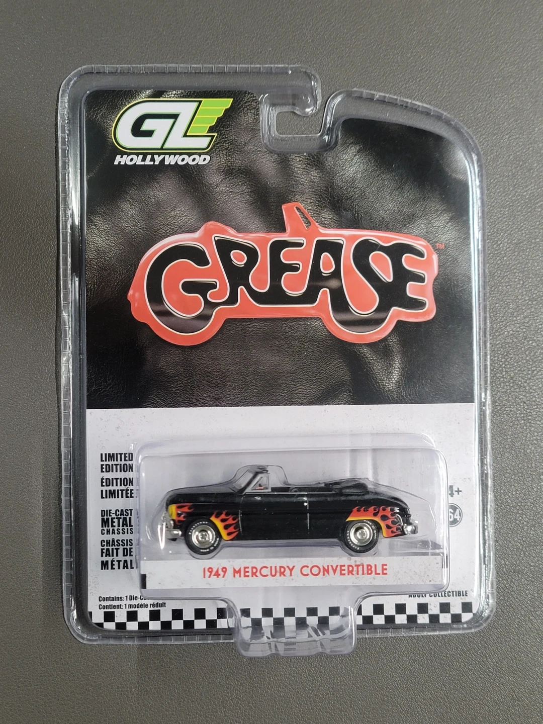 GL Hollywood Grease limited edition 1949 Mercury Convertible die-cast metal car. It's a black convertible with flame decals. Adult collectible.