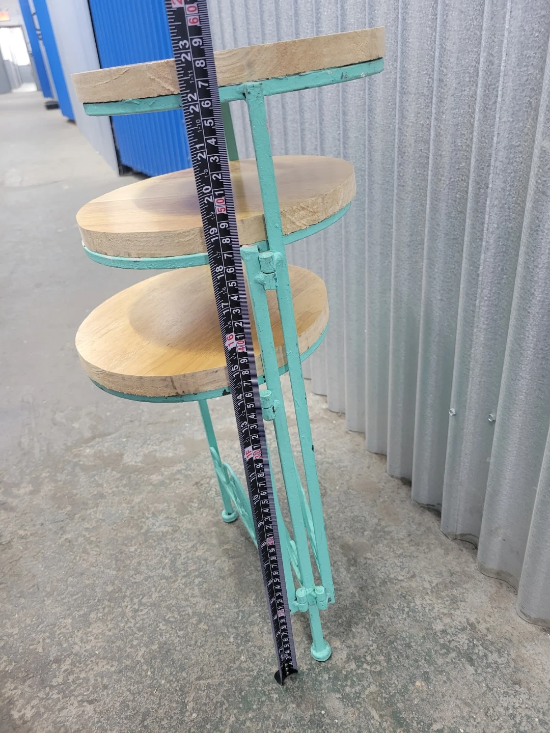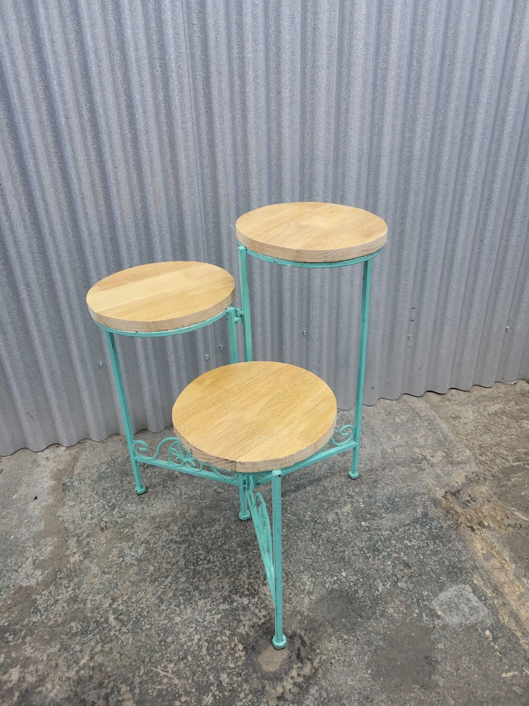 This is a three-tiered plant stand with a turquoise metal frame and wooden top surfaces. The decorative scrollwork on the base adds a charming touch. Measurements for the circular shelf are approximately 9 inches in diameter. Tall is 23". It's perfect for displaying small potted plants indoors or on a patio!