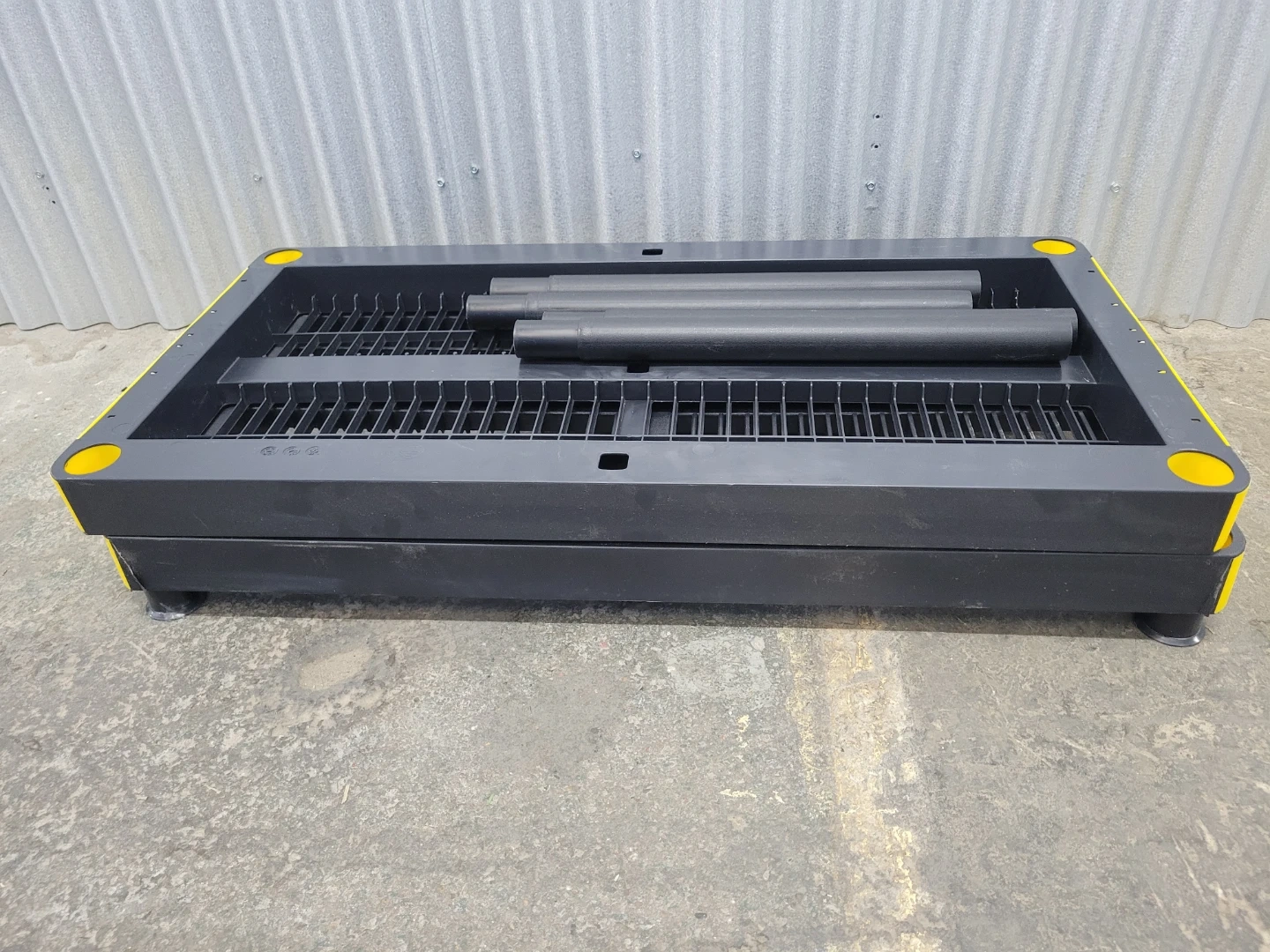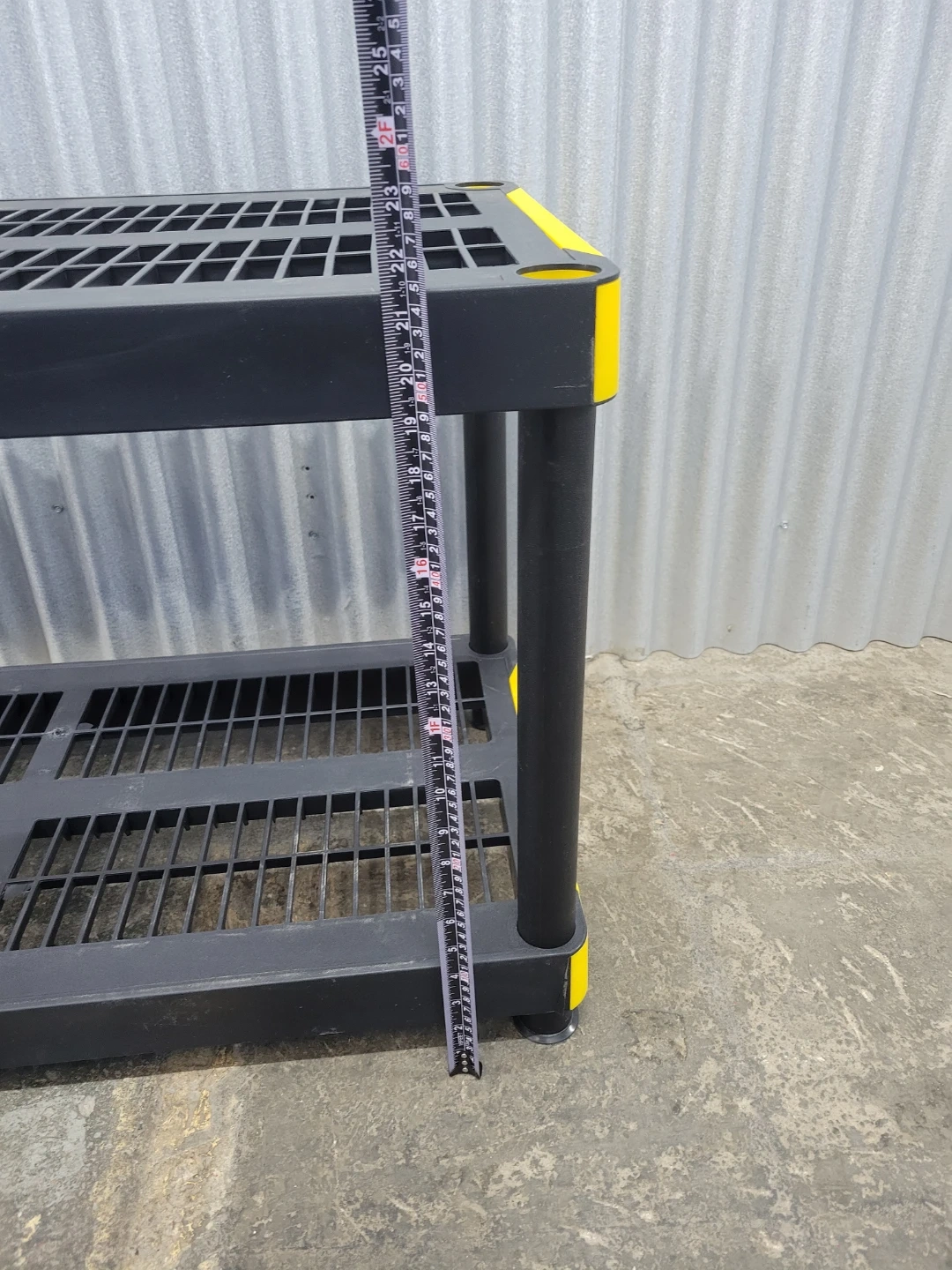 This is a black 2-tier plastic shelf unit. It has yellow corner accents and black posts. The shelves are vented for airflow. It's approximately 36 inches long, 18 inches deep, and 21,5 inches high.