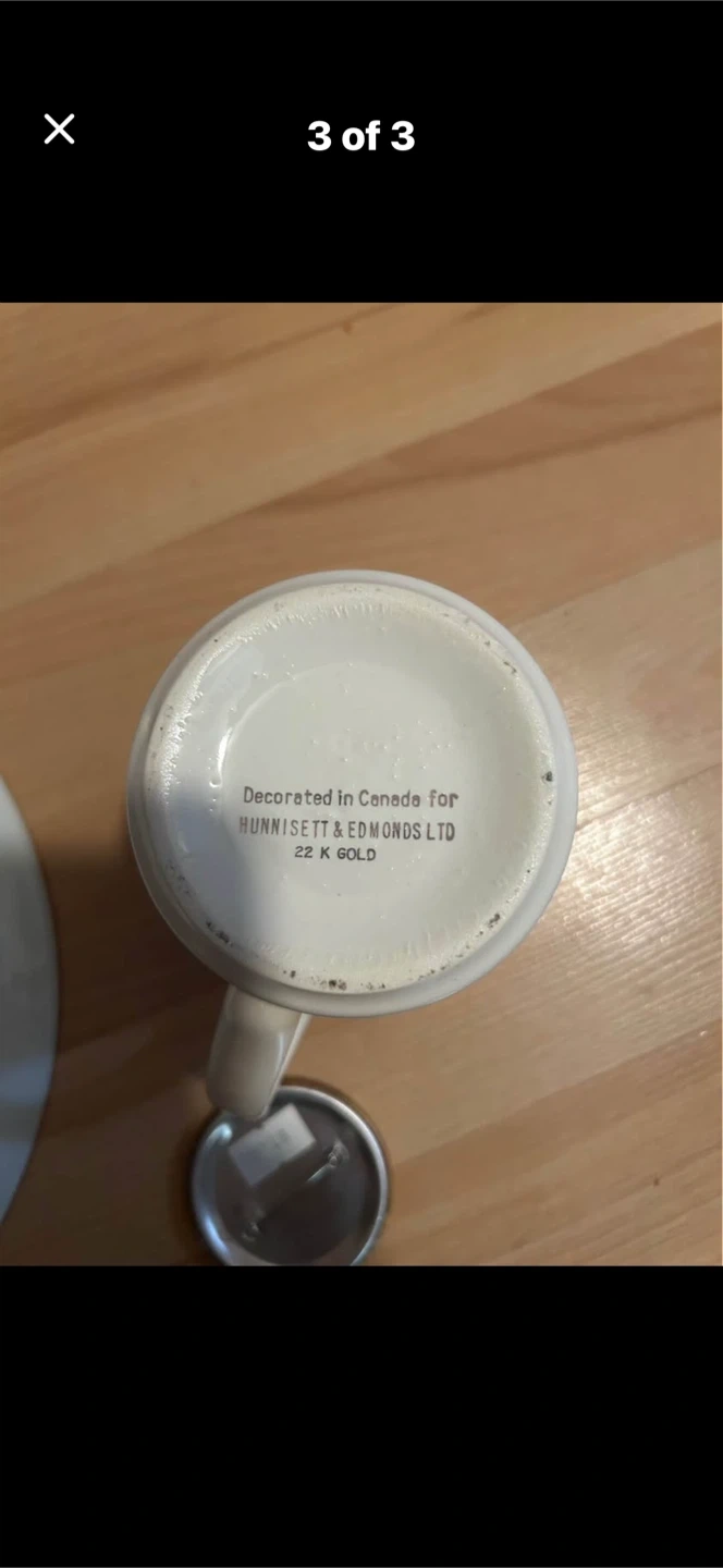 This set includes a collectible plate, a mug, and two pins featuring Pope John Paul II. The mug is decorated in Canada for Hunnisett & Edmonds Ltd. with 22 K gold trim. A great set for collectors!